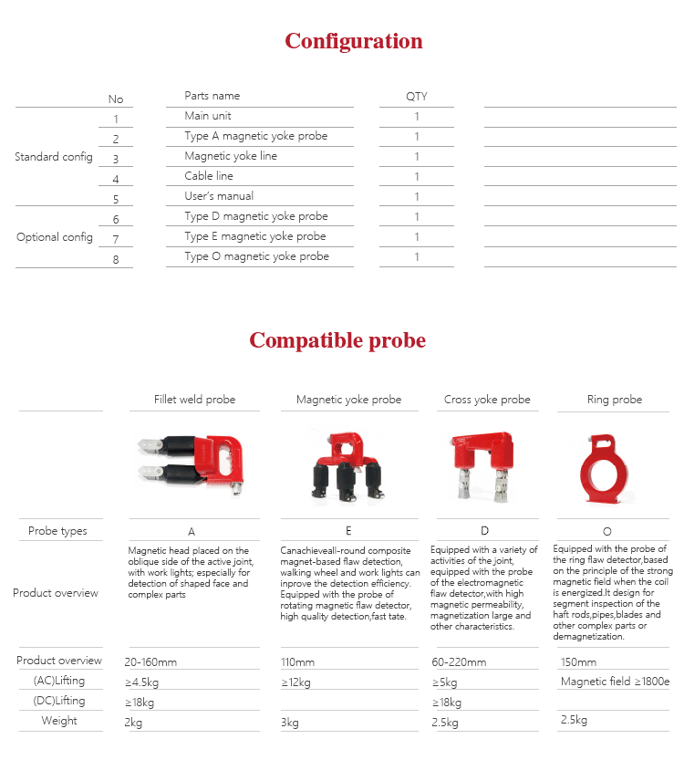 Type D probe is also called magnetic yoke probe, equips with various high magnetic turning joint, the turning joint can closely tie to the fillet weld, use magnetic suspending liquid make it magnetized, the crack in front of probe can be showed out. |