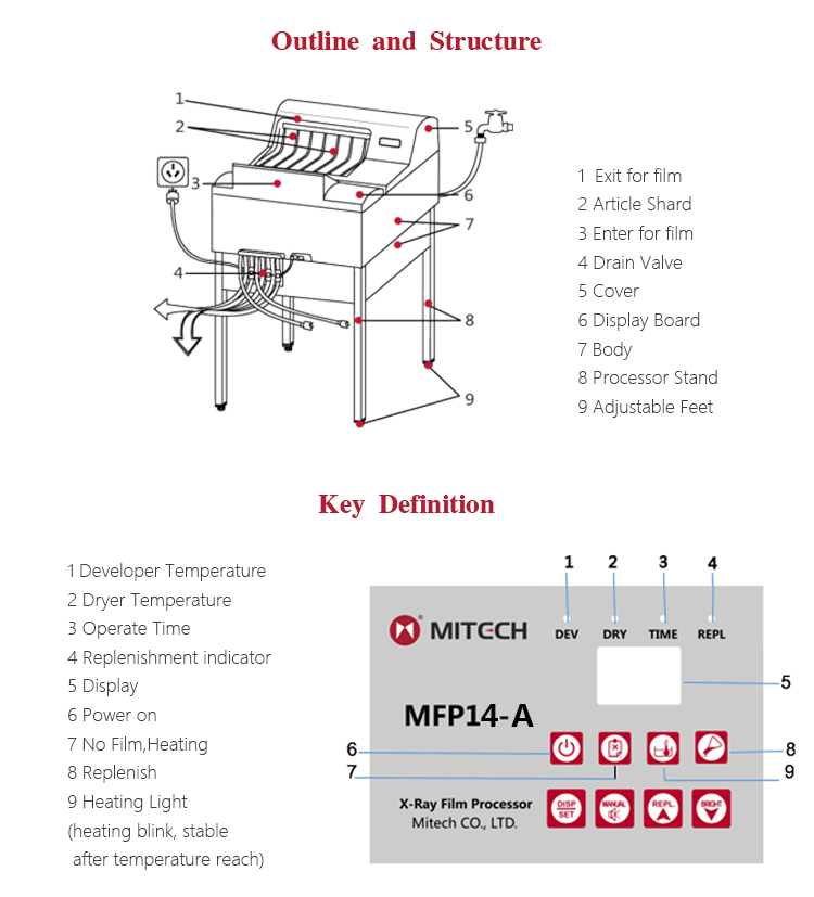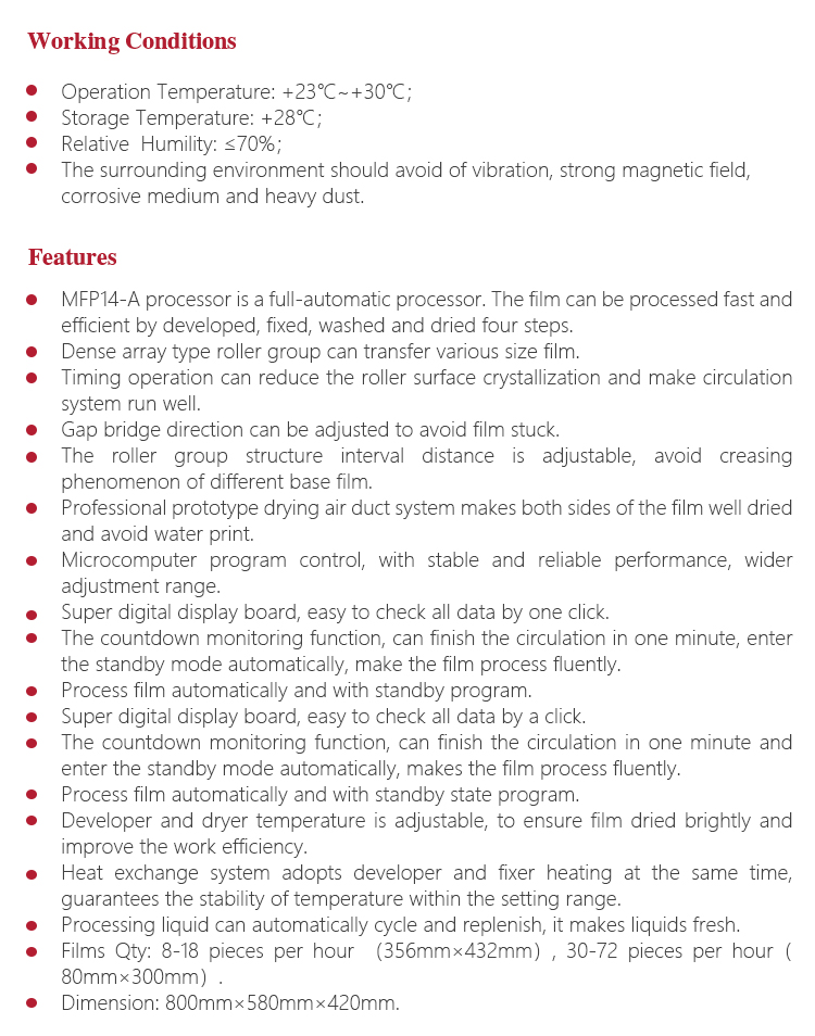 MFP14-A processor is a full-automatic processor. The film can be processed fast and efficient by developed, fixed, washed and fried four steps.