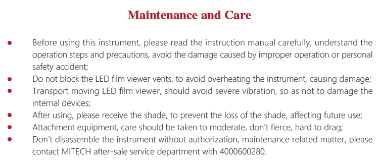 l Don’t disassemble the instrument without authorization, maintenance related matter, please contact MITECH after sale service department with 4000600280.