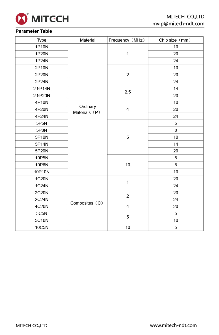 Product OverviewMitech ultrasonic straight probe, choice superior performance of the piezoelectric material chip, damping block and protective film. Strong penetration, high signal to noise ratio, has good wear resistance, excellent near surface resolution, smaller scattering noise. The key manufacturing processes using special equipment and fixtures, as far as possible to exclude the impact of human factors. Can provide high-quality customized solutions to meet the special needs of customers. Straight probe is suitable for plate, large forgings, blanks, castings testing. Use of test equipment and test blocks in line with relevant standards at home and abroad to carry out rigorous calibration, the quality of the inspection section demanding perfect. Available with the probe serial number uniquely corresponding to the measured echo waveforms and spectrograms. All data traceability, can provide distance wave curve certificate according to customer needs. Consistent with "EN12668-2" and other relevant standards at home and abroad, compatible with a variety of BNC (Q9), Q6 connector GB, American standard probe interface and LEMO-00 (C5), LEMO-1 (C9), Microdot (L5) and other European standard connector.