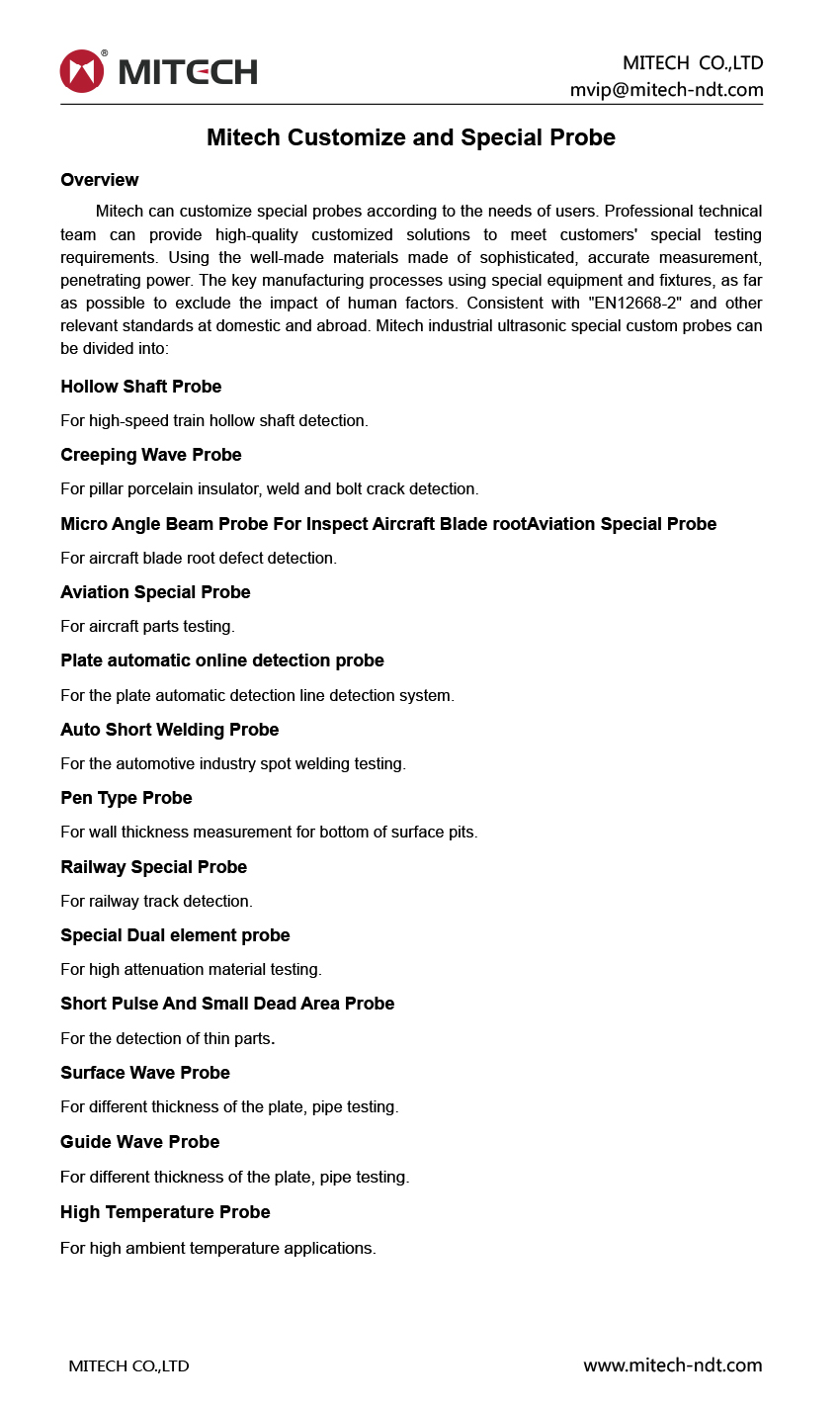 Product OverviewMitech can customize special probes according to the needs of users. Professional technical team can provide high-quality customized solutions to meet customers' special testing requirements. Using the well-made materials made of sophisticated, accurate measurement, penetrating power. The key manufacturing processes using special equipment and fixtures, as far as possible to exclude the impact of human factors. Consistent with "EN12668-2" and other relevant standards at domestic and abroad.