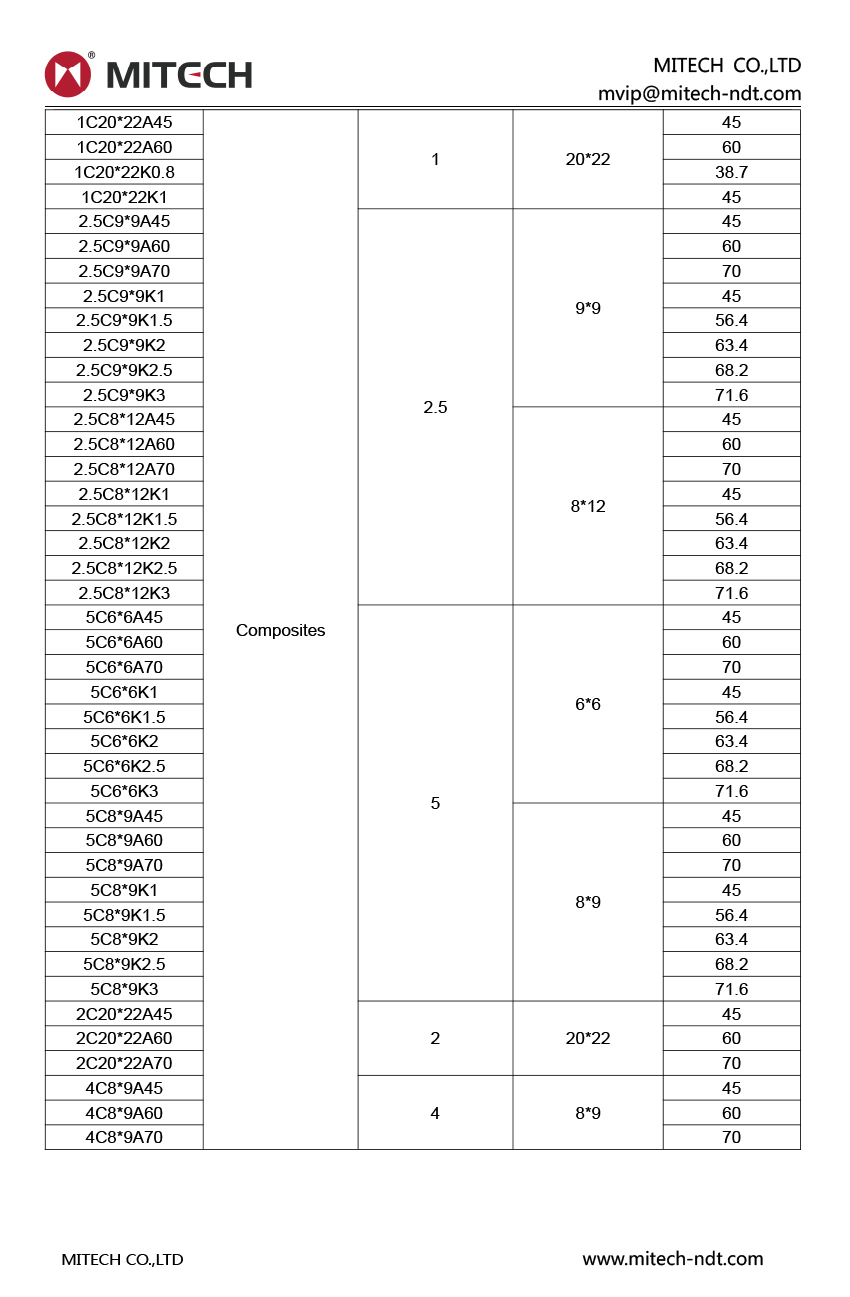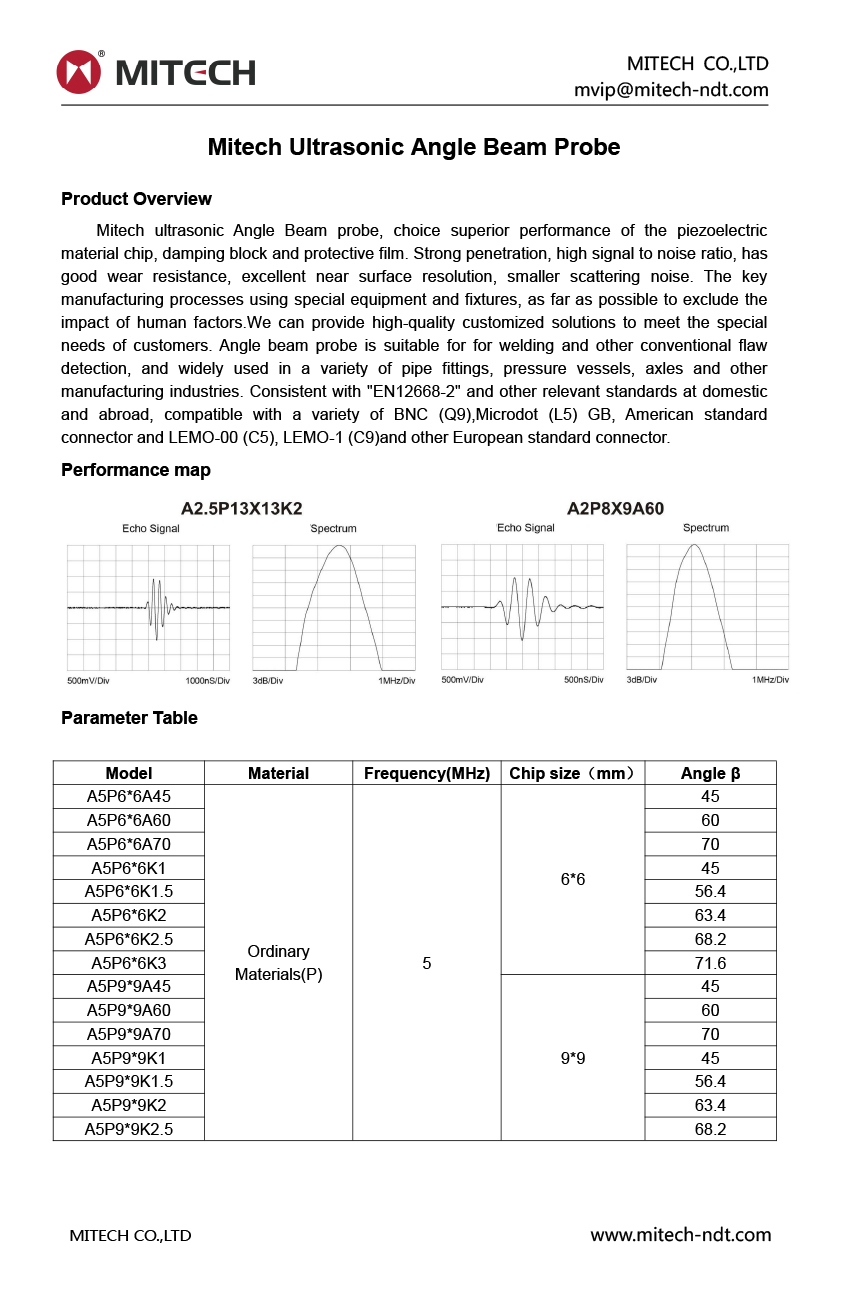 Mitech ultrasonic Angle Beam probe, choice superior performance of the piezoelectric material chip, damping block and protective film. Strong penetration, high signal to noise ratio, has good wear resistance, excellent near surface resolution, smaller scattering noise. The key manufacturing processes using special equipment and fixtures, as far as possible to exclude the impact of human factors.We can provide high-quality customized solutions to meet the special needs of customers. Angle beam probe is suitable for for welding and other conventional flaw detection, and widely used in a variety of pipe fittings, pressure vessels, axles and other manufacturing industries. Consistent with "EN12668-2" and other relevant standards at domestic and abroad, compatible with a variety of BNC (Q9),Microdot (L5) GB, American standard connector and LEMO-00 (C5), LEMO-1 (C9)and other European standard connector.
