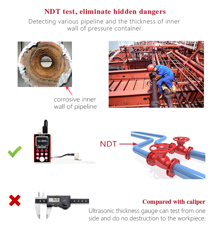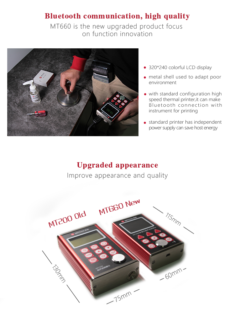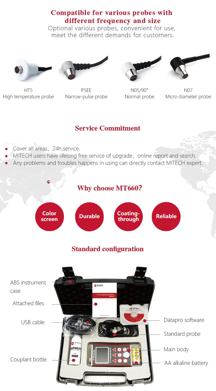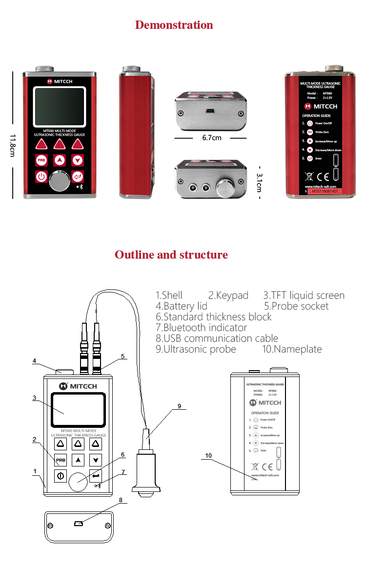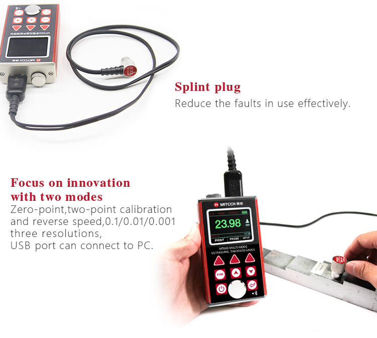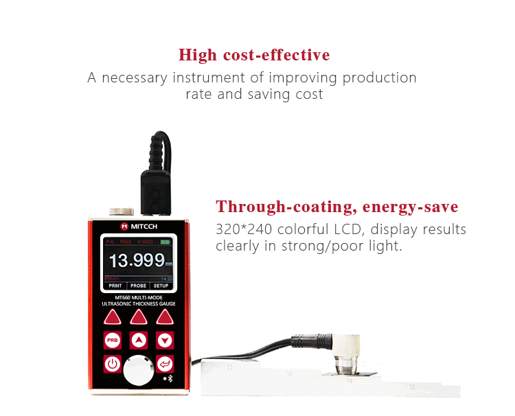 MT660 multi-mode ultrasonic thickness gauge is the newest promoted upgraded product by Mitech. It pays more attention to user experience and functional innovation. Adopted with 320*240 colorful LCD display, it can show you clear measurement result under dim light and strong sunshine environment, improved the visual experience greatly. Sealed aluminum-magnesium alloy case delicate design, smaller volume, better quality are specially designed for defense against oil, dust in the bad sit environment. With intelligent warning function, it will promote automatically when beyond the setting range, it is convenient for reading. It can meet the efficient collecting material’s multiple points’ thickness accurate testing demand. It supports 0.001 high accuracy display and Bluetooth communication. With through coating mode and common mode, its unique performance of capable for testing thickness through the coating provides efficient solution for testing the workpiece of coated surface or corrosion materials. It can measure the workpiece directly without needing to get rid of the surface coating before measurement. It’s widely used for monitoring the production equipments’ various pipelines and pressure vessel corrosion reducing degree in the fields of petroleum, chemical, metallurgy, shipbuilding, aviation, aerospace and so on. It also can be used for making accurate measurement to various plates and machining parts. It is the necessary professional precision instrument for improving the production efficiency and qualification rate as well as saving cost.