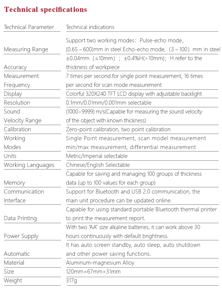 When the thickness gauge appears some other abnormal phenomena, please do not dismantle or adjust any fixedly assembled parts. Fill in and present the warranty card to us. The warranty service can be carried on. Keep it away from vibration, strong magnetic field, corrosive medium, dumpiness and dust. Storage in ordinary temperature. With Original packing, transport is allowed on the third grade highway.