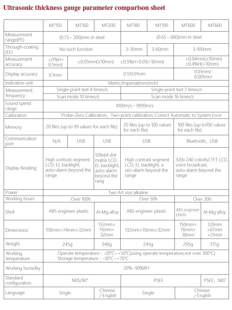 Mitech series ultrasonic thickness gauges, with low-power design and long standby, MT150/MT160/MT200/MT180/MT190/MT600/MT660 are with two AA size alkaline batteries for power supply, easy to replace.
