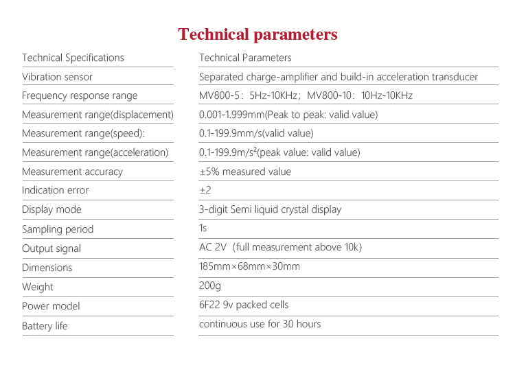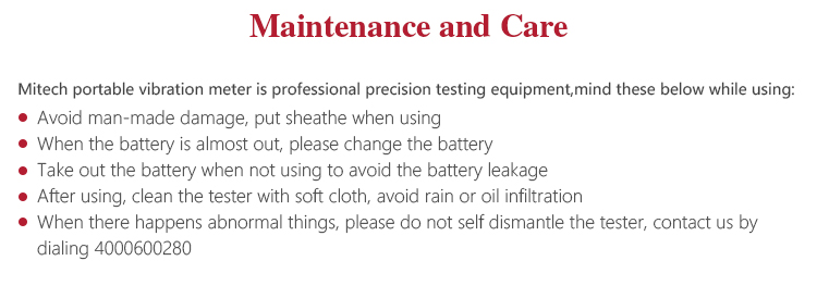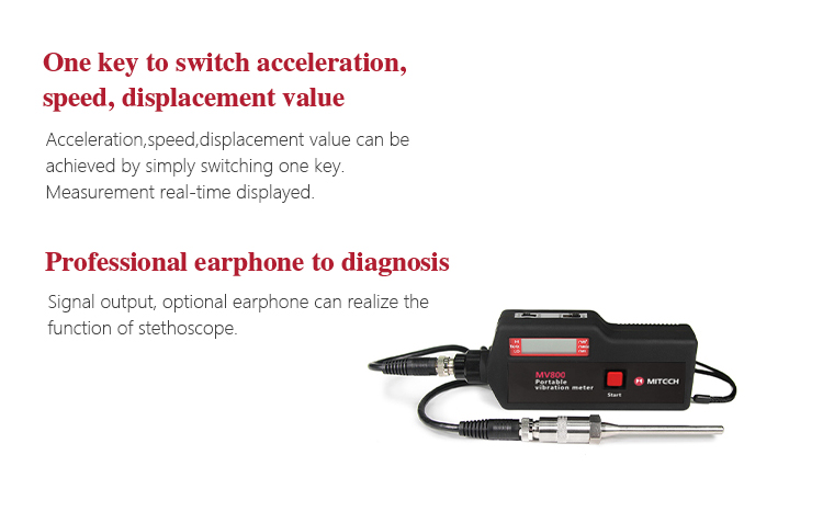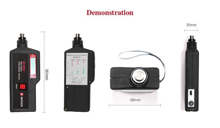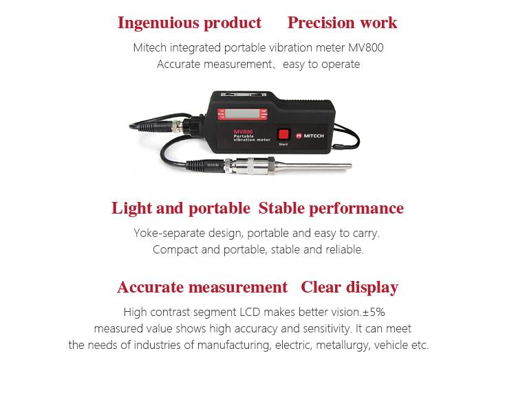 MITECH portable vibration meter MV800 is made up of piezoelectric transducer and digital display circuit. It is mainly used to measure vibration acceleration, speed and displacement of various rotary machine. This product has the advantages of large measurement, wide variety, intuitively demonstration, small size, light weight etc. It is widely used in measurement on site or at height and can reduce the working strength, improve the working efficiency.