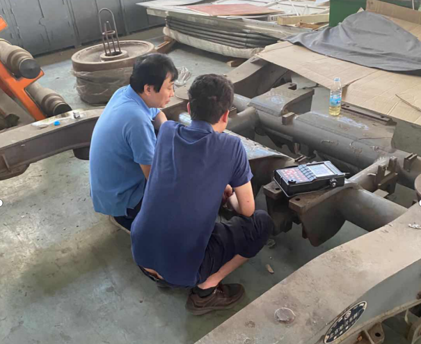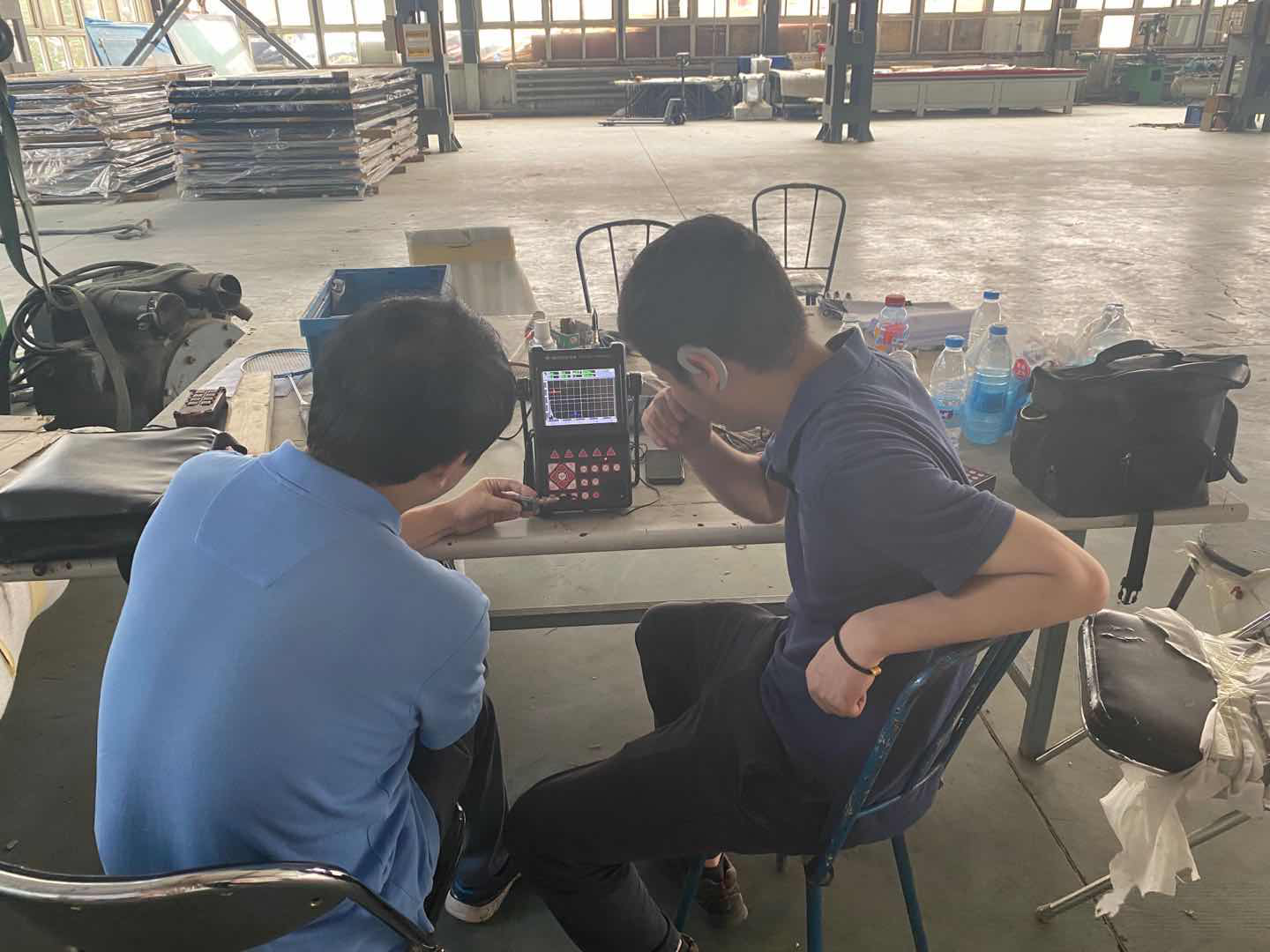 在車間,教授為我們講解了高鐵車廂的結(jié)構(gòu)構(gòu)成,和工件的整體結(jié)構(gòu)構(gòu)成及工作承重環(huán)境。了解了工件的大體結(jié)構(gòu)后,美泰工程師首先使用美泰超聲波測厚儀和涂層測厚儀對工件板材、管件厚度及表面涂層厚度基本參數(shù)進(jìn)行測量,而后使用美泰超聲波探傷儀對待檢焊縫進(jìn)行實(shí)地探傷試驗(yàn)。