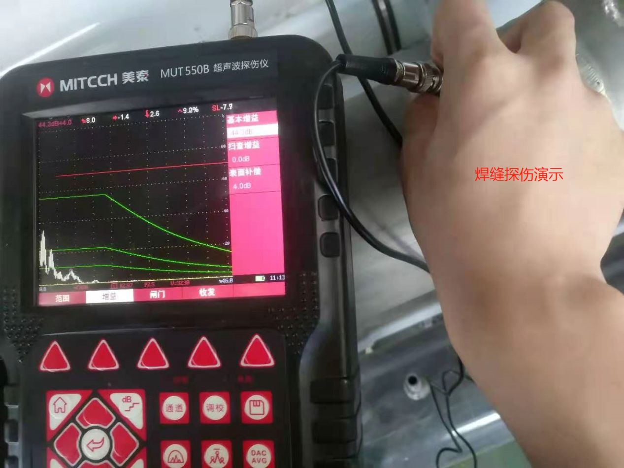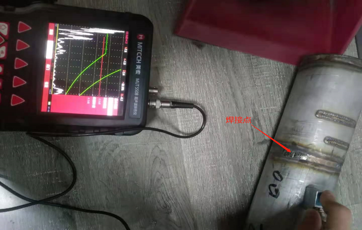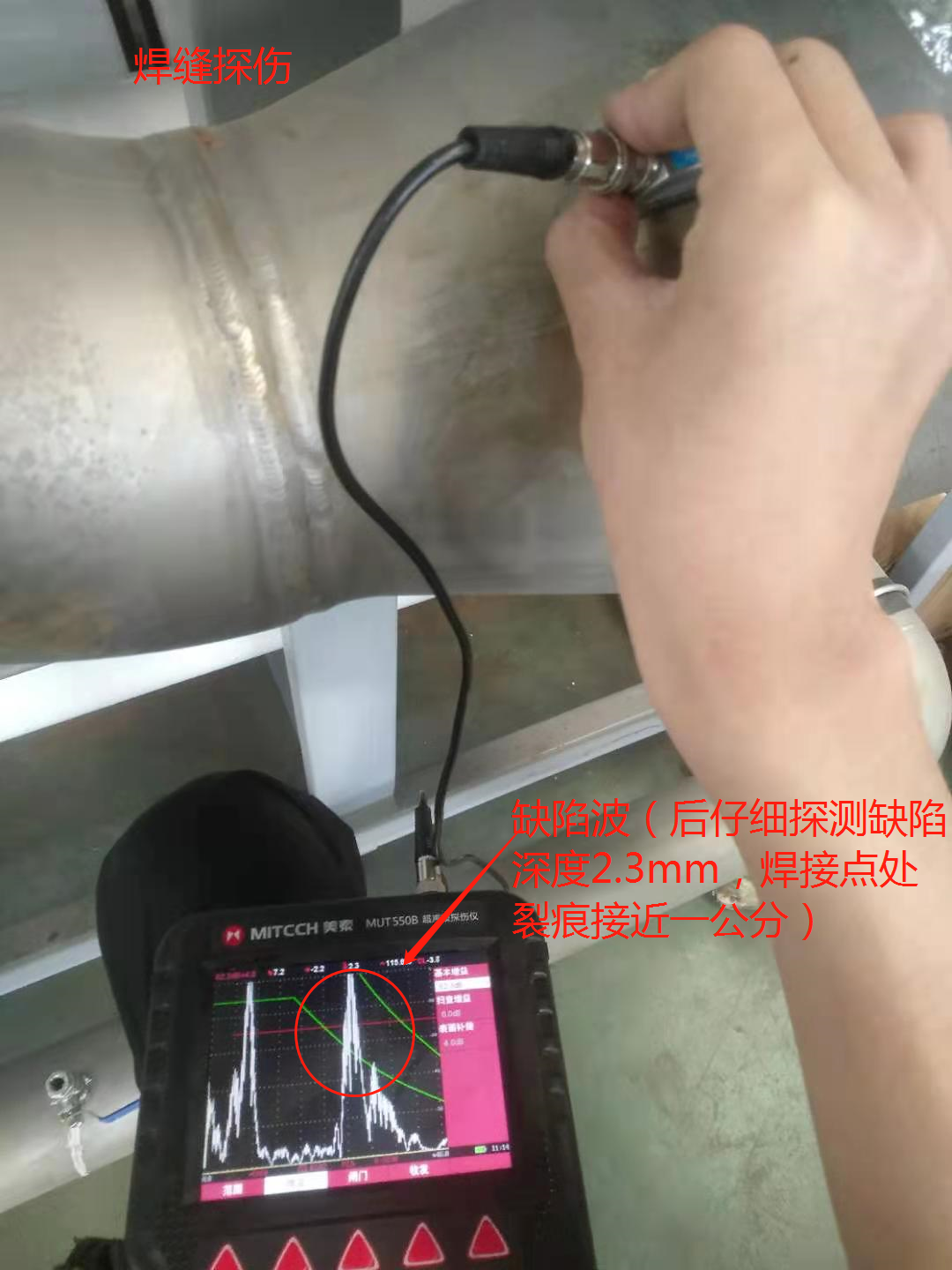 現(xiàn)場了解到,待測工件為4-8mm的管道焊縫,焊接工藝采用的是不銹鋼焊絲焊的氣體保護(hù)焊,主要是對接焊和角焊,現(xiàn)場目視焊縫焊接基本美觀平整。根據(jù)實(shí)際情況,美泰工程師選用2.5p 9*9 k3的單晶斜探頭進(jìn)行檢測,對接焊處焊接點(diǎn)可以觀察到明顯的缺陷波。對接焊接管道處進(jìn)行全面掃查探傷后,焊接點(diǎn)缺陷明顯,角焊處角落有小氣泡的存在。