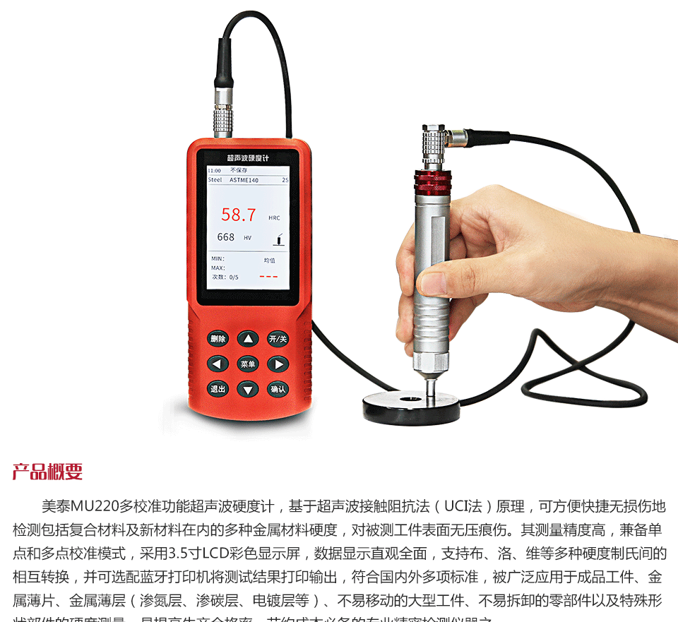 產(chǎn)品概述 美泰MU220多校準(zhǔn)功能超聲波硬度計,基于超聲波接觸阻抗法(UCI法)原理,可方便快捷無損傷地檢測包括復(fù)合材料及新材料在內(nèi)的多種金屬材料硬度,對被測工件表面無壓痕傷。其測量精度高,兼?zhèn)鋯吸c(diǎn)和多點(diǎn)校準(zhǔn)模式,采用3.5寸LCD彩色顯示屏,數(shù)據(jù)顯示直觀全面,支持布、洛、維等多種硬度制氏間的相互轉(zhuǎn)換,并可選配藍(lán)牙打印機(jī)將測試結(jié)果打印輸出,符合國內(nèi)外多項(xiàng)標(biāo)準(zhǔn),被廣泛應(yīng)用于成品工件、金屬薄片、金屬薄層(滲氮層、滲碳層、電鍍層等)、不易移動的大型工件、不易拆卸的零部件以及特殊形狀部件的硬度測量,是提高生產(chǎn)合格率、節(jié)約成本必備的專業(yè)精密檢測儀器之一。