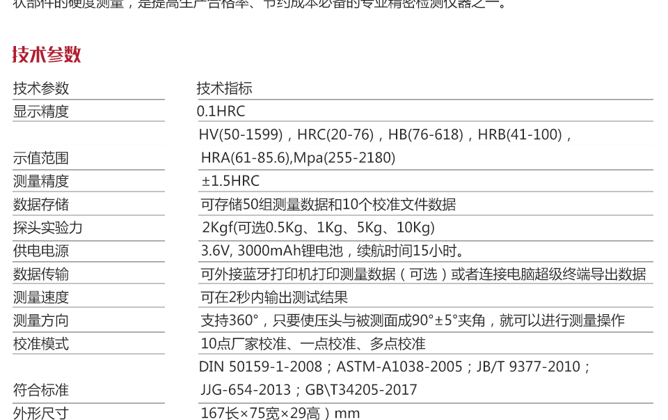 | 測量方向 | 支持360°,只要使壓頭與被測面成90°±5°夾角,就可以進(jìn)行測量操作 |