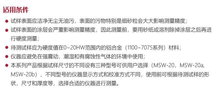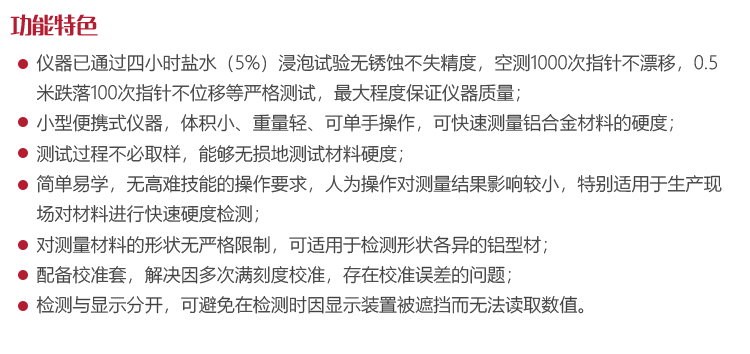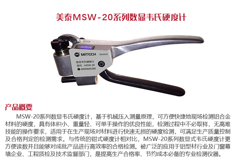 產(chǎn)品概述MSW-20系列數(shù)顯韋氏硬度計,分為MSW-20、MSW-20a、MSW-20b三種型號,它們體積小、重量輕、可單手操作,檢測過程中不必取樣,無高難技能的操作要求,適用于在生產(chǎn)現(xiàn)場對材料進(jìn)行快速無損的硬度檢測。與傳統(tǒng)鉗式硬度計相對比,數(shù)字顯示更方便讀數(shù)??蓾M足生產(chǎn)質(zhì)量控制及合格判定的檢測需求,對成批產(chǎn)品進(jìn)行逐件檢測。被廣泛的應(yīng)用于鋁型材行業(yè)及諸多門窗幕墻企業(yè)、工程質(zhì)檢及技術(shù)監(jiān)督部門,是提高生產(chǎn)合格率、節(jié)約成本必備的專業(yè)儀器。