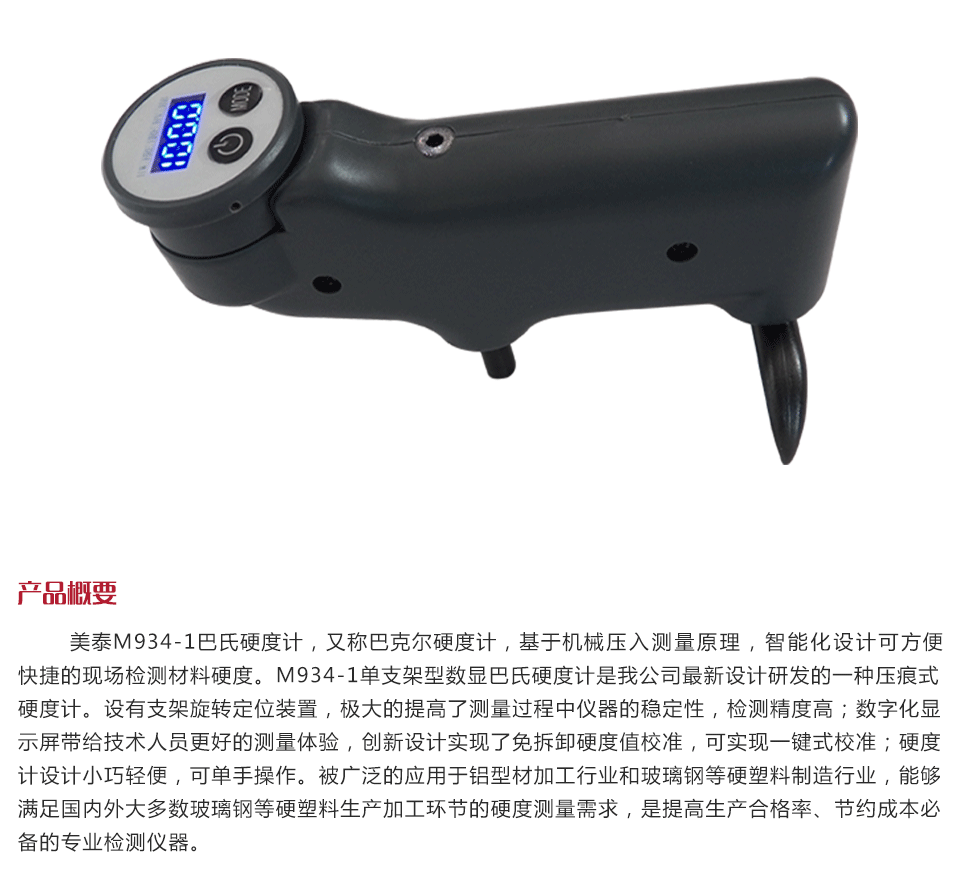 美泰M934-1巴氏硬度計,又稱巴克爾硬度計,基于機械壓入測量原理,智能化設計可方便快捷的現(xiàn)場檢測材料硬度。M934-1單支架型數(shù)顯巴氏硬度計是我公司最新設計研發(fā)的一種壓痕式硬度計。設有支架旋轉定位裝置,極大的提高了測量過程中儀器的穩(wěn)定性,檢測精度高;數(shù)字化顯示屏帶給技術人員更好的測量體驗,創(chuàng)新設計實現(xiàn)了免拆卸硬度值校準,可實現(xiàn)一鍵式校準;硬度計設計小巧輕便,可單手操作。被廣泛的應用于鋁型材加工行業(yè)和玻璃鋼等硬塑料制造行業(yè),能夠滿足國內外大多數(shù)玻璃鋼等硬塑料生產加工環(huán)節(jié)的硬度測量需求,是提高生產合格率、節(jié)約成本必備的專業(yè)檢測儀器。