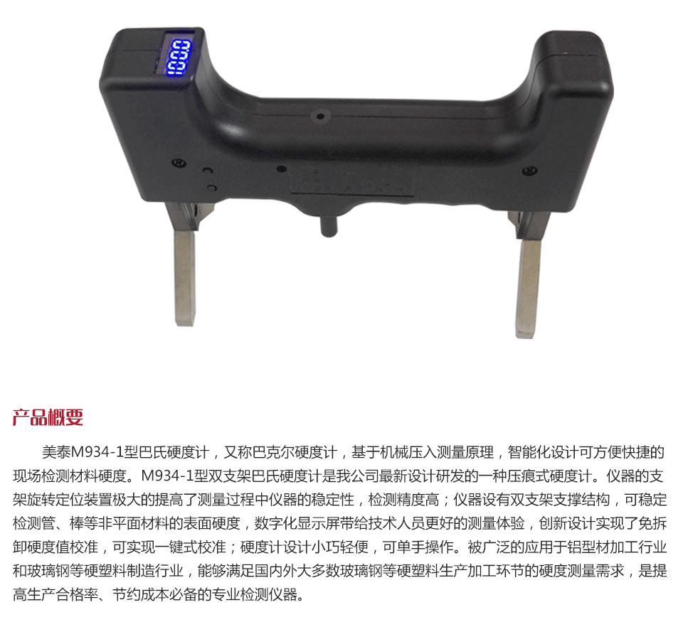 美泰M934-1型巴氏硬度計(jì),又稱巴克爾硬度計(jì),基于機(jī)械壓入測(cè)量原理,智能化設(shè)計(jì)可方便快捷的現(xiàn)場(chǎng)檢測(cè)材料硬度。M934-1型雙支架巴氏硬度計(jì)是我公司最新設(shè)計(jì)研發(fā)的一種壓痕式硬度計(jì)。儀器的支架旋轉(zhuǎn)定位裝置極大的提高了測(cè)量過(guò)程中儀器的穩(wěn)定性,檢測(cè)精度高;儀器設(shè)有雙支架支撐結(jié)構(gòu),可穩(wěn)定檢測(cè)管、棒等非平面材料的表面硬度,數(shù)字化顯示屏帶給技術(shù)人員更好的測(cè)量體驗(yàn),創(chuàng)新設(shè)計(jì)實(shí)現(xiàn)了免拆卸硬度值校準(zhǔn),可實(shí)現(xiàn)一鍵式校準(zhǔn);硬度計(jì)設(shè)計(jì)小巧輕便,可單手操作。被廣泛的應(yīng)用于鋁型材加工行業(yè)和玻璃鋼等硬塑料制造行業(yè),能夠滿足國(guó)內(nèi)外大多數(shù)玻璃鋼等硬塑料生產(chǎn)加工環(huán)節(jié)的硬度測(cè)量需求,是提高生產(chǎn)合格率、節(jié)約成本必備的專業(yè)檢測(cè)儀器。