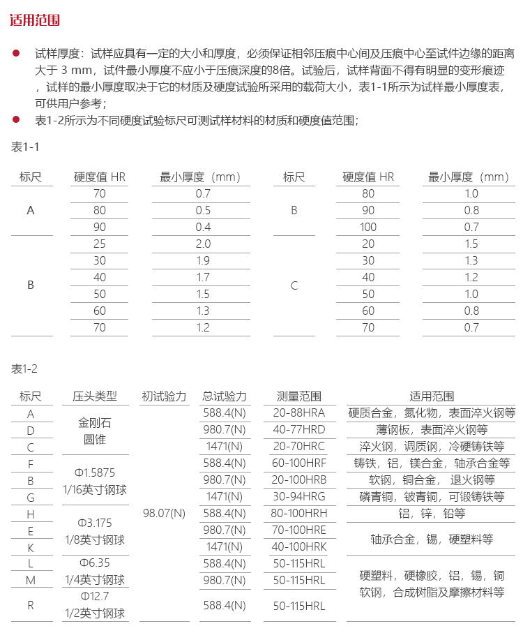 | 測(cè)試范圍 | HRA:20-95、HRB:10-100、HRC:10-70、HRD:40-77、HRE:70-100、HRF:60-100、HRG:30-94、HRH:80-100、HRK:40-100、HRL:5 |