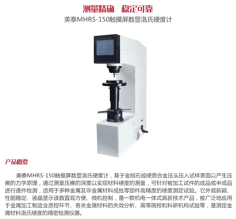產(chǎn)品概述美泰MHRS-150觸摸屏數(shù)顯洛氏硬度計(jì),基于金剛石或硬質(zhì)合金壓頭壓入試樣表面以產(chǎn)生壓痕的力學(xué)原理,通過測(cè)量壓痕的深度以實(shí)現(xiàn)材料硬度的測(cè)量,可針對(duì)被加工試件的成品或半成品進(jìn)行逐件檢測(cè),適用于多種金屬及非金屬材料成批零部件高精度的硬度測(cè)定試驗(yàn)。它外觀新穎、性能穩(wěn)定、液晶顯示讀數(shù)直觀方便、微機(jī)控制,是一款機(jī)電一體式高新技術(shù)產(chǎn)品,被廣泛地應(yīng)用于金屬加工制造業(yè)質(zhì)控環(huán)節(jié)、各類金屬材料的失效分析、高等院校和科研機(jī)構(gòu)試驗(yàn)等,是測(cè)定金屬材料洛氏硬度的精密檢測(cè)儀器。