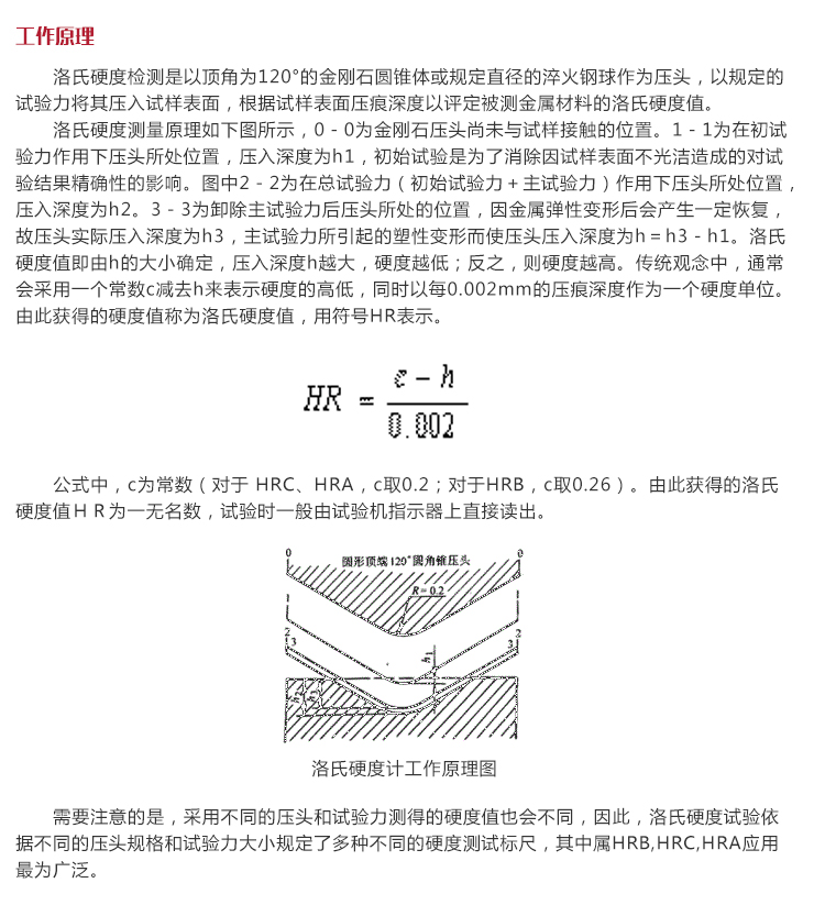 公式中,c為常數(shù)(對(duì)于 HRC、HRA,c取0.2;對(duì)于HRB,c取0.26)。由此獲得的洛氏硬度值HR為一無名數(shù),試驗(yàn)時(shí)一般由試驗(yàn)機(jī)指示器上直接讀出。