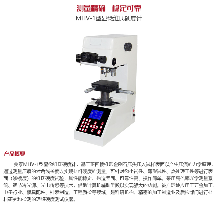 產(chǎn)品概述美泰MHV-1型顯微維氏硬度計(jì),基于正四棱錐形金剛石壓頭壓入試樣表面以產(chǎn)生壓痕的力學(xué)原理,通過測量壓痕的對角線長度以實(shí)現(xiàn)材料硬度的測量,可針對微小試件、薄形試件、熱處理工件等進(jìn)行表面(滲鍍層)的維氏硬度試驗(yàn),其性能穩(wěn)定、構(gòu)造堅(jiān)固、可靠性高、操作簡單,采用高倍率光學(xué)測量系統(tǒng)、調(diào)節(jié)冷光源、光電傳感等技術(shù),借助計(jì)算機(jī)輔助手段以實(shí)現(xiàn)強(qiáng)大的功能。被廣泛地應(yīng)用于五金加工、電子行業(yè)、模具配件、鐘表制造、工程質(zhì)檢等領(lǐng)域,是科研機(jī)構(gòu)、精密的加工制造業(yè)及質(zhì)檢部門進(jìn)行材料研究和檢測的理想硬度測試儀器。