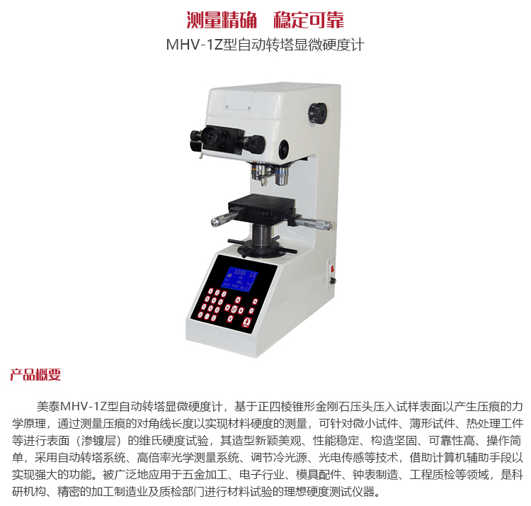 產(chǎn)品概述美泰MHV-1Z型自動(dòng)轉(zhuǎn)塔顯微硬度計(jì),基于正四棱錐形金剛石壓頭壓入試樣表面以產(chǎn)生壓痕的力學(xué)原理,通過測(cè)量壓痕的對(duì)角線長度以實(shí)現(xiàn)材料硬度的測(cè)量,可針對(duì)微小試件、薄形試件、熱處理工件等進(jìn)行表面(滲鍍層)的維氏硬度試驗(yàn),其造型新穎美觀、性能穩(wěn)定、構(gòu)造堅(jiān)固、可靠性高、操作簡單,采用自動(dòng)轉(zhuǎn)塔系統(tǒng)、高倍率光學(xué)測(cè)量系統(tǒng)、調(diào)節(jié)冷光源、光電傳感等技術(shù),借助計(jì)算機(jī)輔助手段以實(shí)現(xiàn)強(qiáng)大的功能。被廣泛地應(yīng)用于五金加工、電子行業(yè)、模具配件、鐘表制造、工程質(zhì)檢等領(lǐng)域,是科研機(jī)構(gòu)、精密的加工制造業(yè)及質(zhì)檢部門進(jìn)行材料試驗(yàn)的理想硬度測(cè)試儀器。