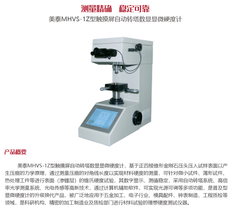 美泰MHVS-1Z型觸摸屏自動(dòng)轉(zhuǎn)塔數(shù)顯顯微硬度計(jì),基于正四棱錐形金剛石壓頭壓入試樣表面以產(chǎn)生壓痕的力學(xué)原理,通過測(cè)量壓痕的對(duì)角線長(zhǎng)度以實(shí)現(xiàn)材料硬度的測(cè)量,可針對(duì)微小試件、薄形試件、熱處理工件等進(jìn)行表面(滲鍍層)的維氏硬度試驗(yàn),其數(shù)字顯示、測(cè)值穩(wěn)定,采用自動(dòng)轉(zhuǎn)塔系統(tǒng)、高倍率光學(xué)測(cè)量系統(tǒng)、光電傳感等高新技術(shù),通過計(jì)算機(jī)輔助軟件,可實(shí)現(xiàn)光源可調(diào)等多項(xiàng)功能,是普及型顯微硬度計(jì)的升級(jí)換代產(chǎn)品,被廣泛地應(yīng)用于五金加工、電子行業(yè)、模具配件、鐘表制造、工程質(zhì)檢等領(lǐng)域,是科研機(jī)構(gòu)、精密的加工制造業(yè)及質(zhì)檢部門進(jìn)行材料試驗(yàn)的理想硬度測(cè)試儀器。
