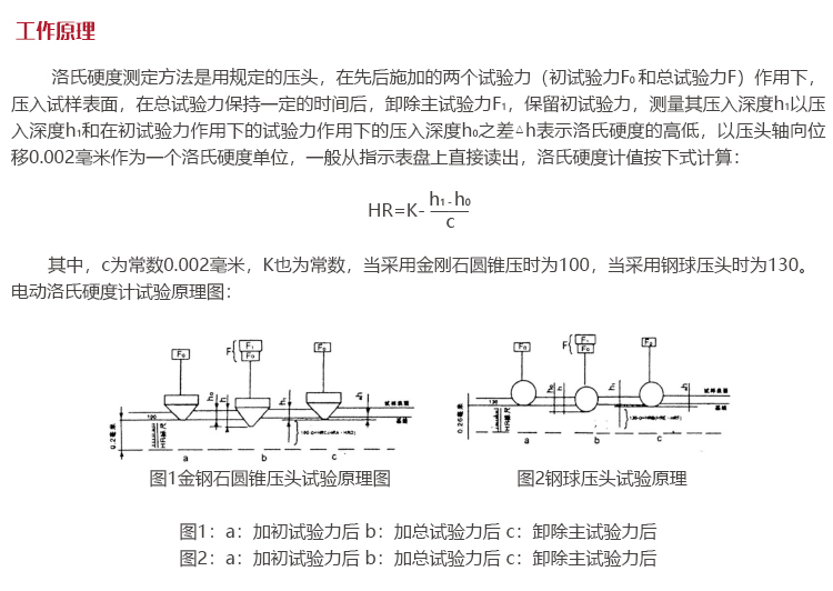 工作原理洛氏硬度測(cè)定方法是用規(guī)定的壓頭,在先后施加的兩個(gè)試驗(yàn)力(初試驗(yàn)力F0和總試驗(yàn)力F)作用下,壓入試樣表面,在總試驗(yàn)力保持一定的時(shí)間后,卸除主試驗(yàn)力F1,保留初試驗(yàn)力,測(cè)量其壓入深度h1以壓入深度h1和在初試驗(yàn)力作用下的試驗(yàn)力作用下的壓入深度h0之差△h表示洛氏硬度的高低,以壓頭軸向位移0.002毫米作為一個(gè)洛氏硬度單位,一般從指示表盤上直接讀出,洛氏硬度計(jì)值按下式計(jì)算: