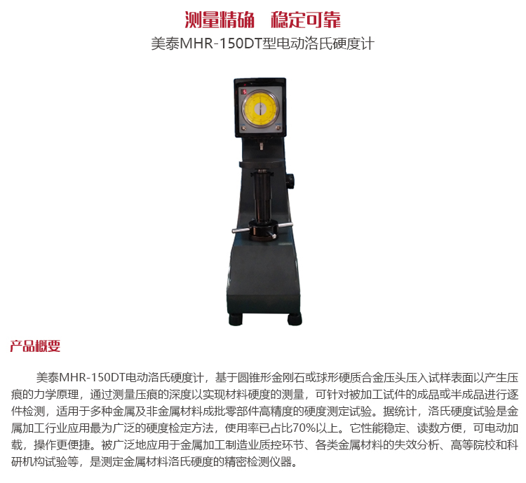 美泰MHR-150DT電動(dòng)洛氏硬度計(jì),基于圓錐形金剛石或球形硬質(zhì)合金壓頭壓入試樣表面以產(chǎn)生壓痕的力學(xué)原理,通過測(cè)量壓痕的深度以實(shí)現(xiàn)材料硬度的測(cè)量,可針對(duì)被加工試件的成品或半成品進(jìn)行逐件檢測(cè),適用于多種金屬及非金屬材料成批零部件高精度的硬度測(cè)定試驗(yàn)。據(jù)統(tǒng)計(jì),洛氏硬度試驗(yàn)是金屬加工行業(yè)應(yīng)用最為廣泛的硬度檢定方法,使用率已占比70%以上。它性能穩(wěn)定、讀數(shù)方便,可電動(dòng)加載,操作更便捷。被廣泛地應(yīng)用于金屬加工制造業(yè)質(zhì)控環(huán)節(jié)、各類金屬材料的失效分析、高等院校和科研機(jī)構(gòu)試驗(yàn)等,是測(cè)定金屬材料洛氏硬度的精密檢測(cè)儀器。