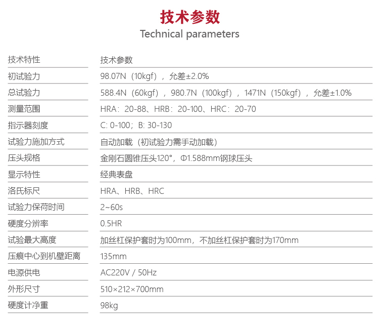 | 壓頭規(guī)格 | 金剛石圓錐壓頭120°,Φ1.588mm鋼球壓頭 |