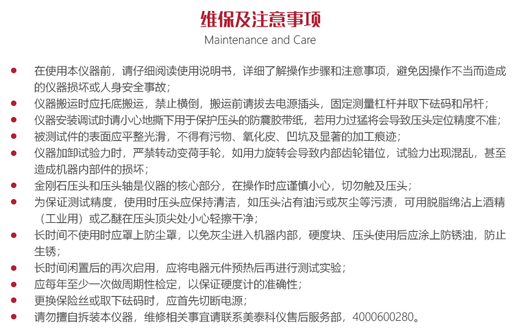 長時間不使用時應罩上防塵罩,以免灰塵進入機器內部,硬度塊、壓頭使用后應涂上防銹油,防止生銹;