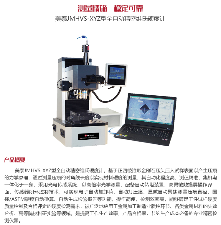 產(chǎn)品概述美泰JMHVS-XYZ型全自動(dòng)精密維氏硬度計(jì),基于正四棱錐形金剛石壓頭壓入試樣表面以產(chǎn)生壓痕的力學(xué)原理,通過測量壓痕的對(duì)角線長度以實(shí)現(xiàn)材料硬度的測量,其自動(dòng)化程度高、測值精準(zhǔn)、集機(jī)電一體化于一身,采用光電傳感系統(tǒng),以高倍率光學(xué)測量,配備自動(dòng)轉(zhuǎn)塔裝置、高靈敏觸摸屏操作界面、傳感器閉環(huán)控制技術(shù)、可實(shí)現(xiàn)電子自動(dòng)加卸荷、自動(dòng)打壓痕、顯微自動(dòng)聚焦測量壓痕直徑、國標(biāo)/ASTM硬度自動(dòng)換算、自動(dòng)生成檢驗(yàn)報(bào)告等功能,操作簡便,檢測效率高,能夠滿足工件試樣硬度質(zhì)量控制及合格評(píng)定的硬度檢測需求,被廣泛地應(yīng)用于金屬加工制造業(yè)質(zhì)控環(huán)節(jié)、各類金屬材料的失效分析、高等院??蒲袑?shí)驗(yàn)等領(lǐng)域,是提高工作生產(chǎn)效率,產(chǎn)品合格率,節(jié)約生產(chǎn)成本必備的專業(yè)精密檢測儀器。