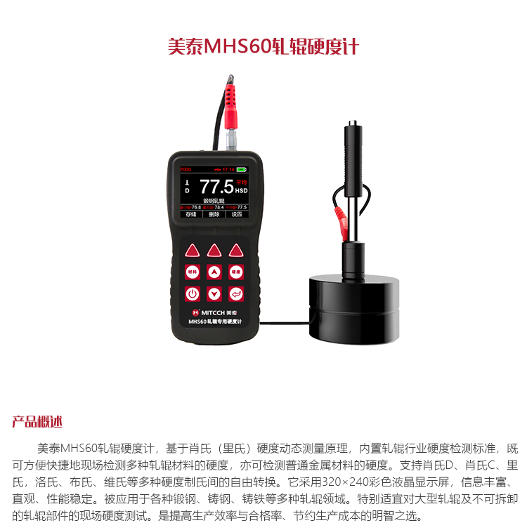 產品概述美泰MHS60軋輥硬度計,基于肖氏(里氏)硬度動態(tài)測量原理,內置軋輥行業(yè)硬度檢測標準,既可方便快捷地現場檢測多種軋輥材料的硬度,亦可檢測普通金屬材料的硬度。支持肖氏D、肖氏C、里氏,洛氏、布氏、維氏等多種硬度制氏間的自由轉換。它采用320×240彩色液晶顯示屏,信息豐富、直觀、性能穩(wěn)定。被應用于各種鍛鋼、鑄鋼、鑄鐵等多種軋輥領域。特別適宜對大型軋輥及不可拆卸的軋輥部件的現場硬度測試。是提高生產效率與合格率、節(jié)約生產成本的明智之選。
