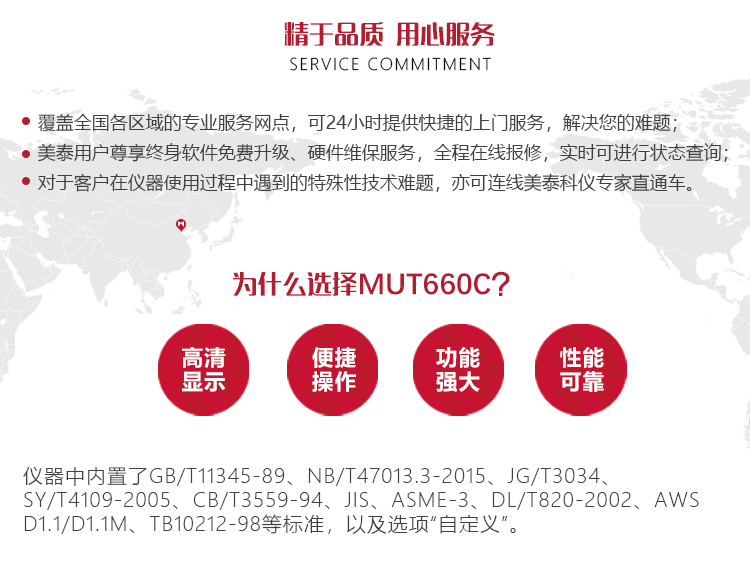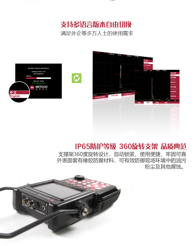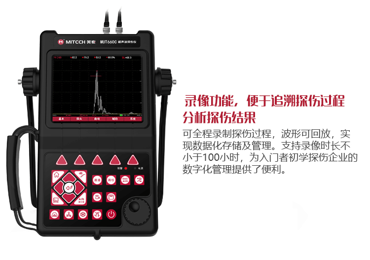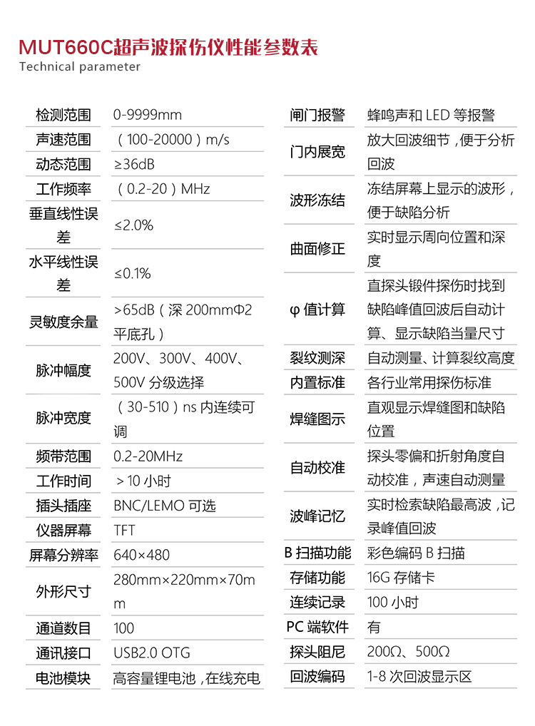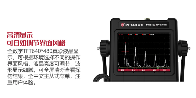 產(chǎn)品概述MUT660C智能數(shù)字式超聲波探傷儀是美泰公司專注多年精心研制的旗艦產(chǎn)品,其設(shè)計獨特、制造精良、操作便捷、功能強勁,集諸多優(yōu)勢于一身,自問世以來一直倍受用戶親睞,它能夠快速便捷、無損傷、精確地進行工件內(nèi)部多種缺陷(裂紋、夾雜、氣孔等)的檢測、定位、評估和診斷。采用全數(shù)字TFT 640×480真彩色液晶顯示屏,可根據(jù)環(huán)境選擇操作界面風(fēng)格,液晶亮度可調(diào)節(jié),界面設(shè)計人性化、波形顯示細(xì)膩;可全屏清晰發(fā)現(xiàn)缺陷;單手可把持操作,曲線制作、探頭校準(zhǔn)等常規(guī)操作均可自動完成;核心處理器CPU主頻400M,能快速完成復(fù)雜運算,實現(xiàn)智能缺陷分析;低功耗設(shè)計配備大容量高性能鋰離子電池模塊可連續(xù)工作10小時以上;全中文主從式菜單,注重用戶體驗,集快捷按鍵、數(shù)碼飛梭旋輪、十字菜單三種操作方式于一體,不同使用習(xí)慣均可操作自如;支持多語言。防水、防油、防塵可達(dá)到IP65防護等級。是石油、化工、冶金、造船、航空、鐵路等領(lǐng)域缺陷檢測、質(zhì)量控制、在役安全監(jiān)測與壽命評估必備的專業(yè)精密儀器。