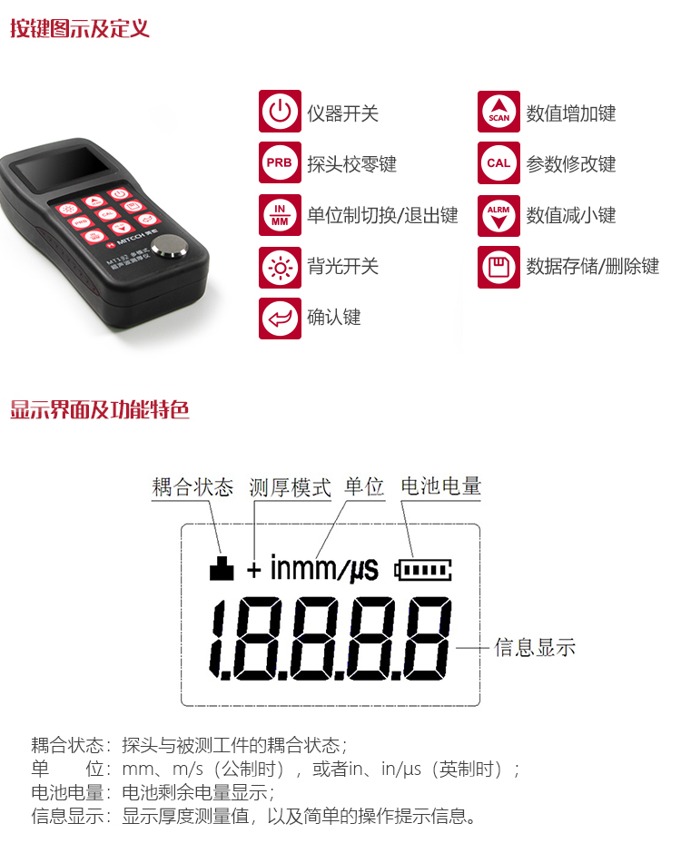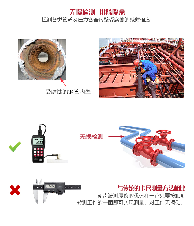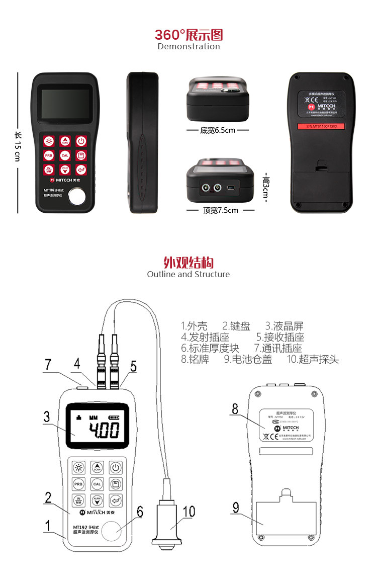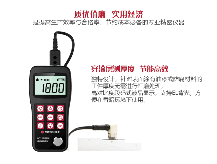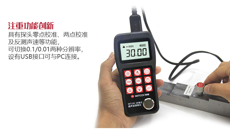 產(chǎn)品概述美泰MT192超聲波測(cè)厚儀,基于超聲波測(cè)量原理,可對(duì)金屬、塑料、陶瓷、玻璃及其他多種超聲波的良導(dǎo)體材料進(jìn)行厚度測(cè)量,也可實(shí)現(xiàn)對(duì)材料聲速的反測(cè)。與傳統(tǒng)的測(cè)量方法相比,超聲波測(cè)厚儀的優(yōu)勢(shì)在于它只要接觸到被測(cè)工件的一面即可完成測(cè)量,其獨(dú)特的可穿透涂層測(cè)厚度的性能為表面涂有油漆或防腐材料的工件厚度檢測(cè)提供了更加高效的解決方案,測(cè)量前無(wú)需處理掉表面的涂層,可以直接測(cè)量。被廣泛應(yīng)用于石油、化工、冶金、造船、航空、航天等領(lǐng)域的生產(chǎn)設(shè)備中各種管道及壓力容器腐蝕減薄程度的監(jiān)測(cè),也可用于對(duì)各種板材及各種加工零件做精確的測(cè)量。是提高生產(chǎn)效率與合格率、節(jié)約成本必備的專業(yè)精密儀器。