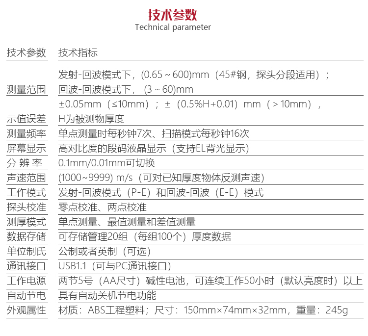 | 測(cè)厚模式 | 發(fā)射-回波模式(P-E)和回波-回波(E-E)模式 |