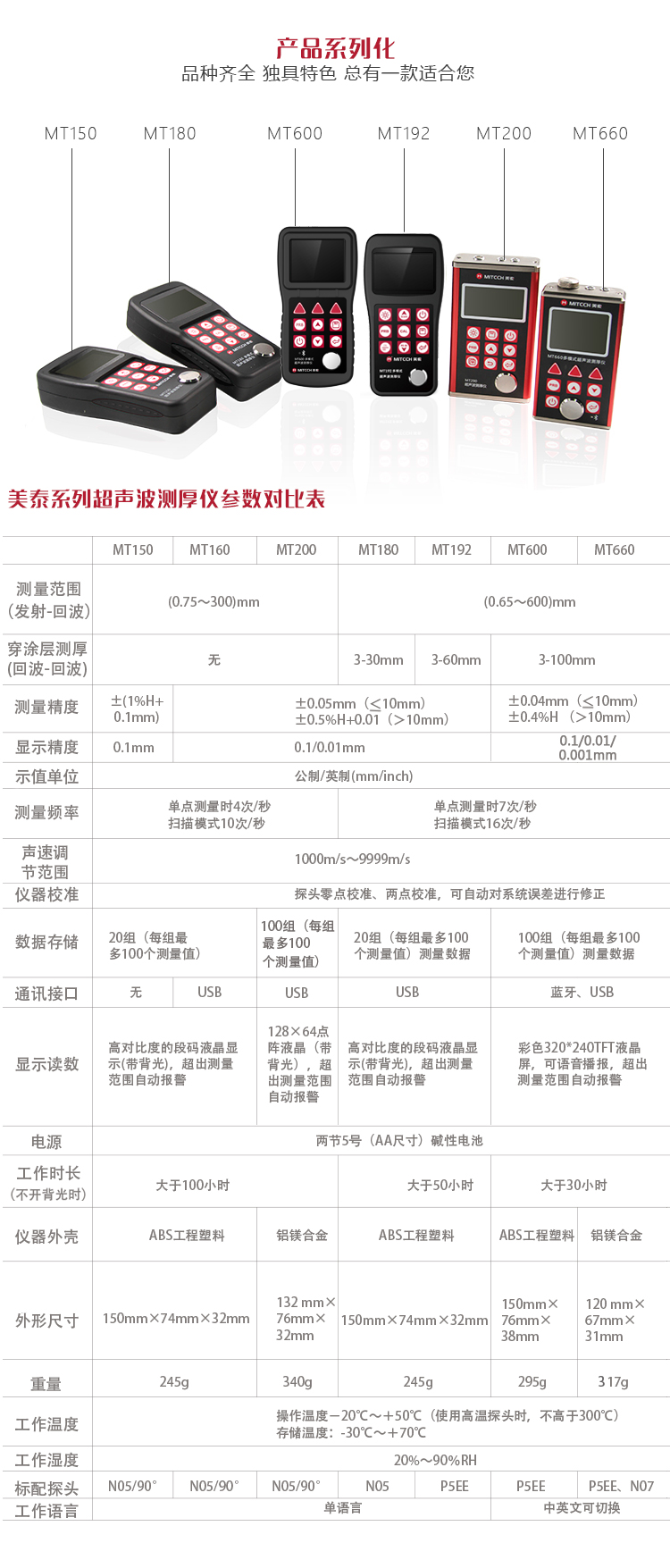 | 美泰系列超聲波測(cè)厚儀,均采用低功耗設(shè)計(jì)理念,超長(zhǎng)待機(jī),MT150/MT160/MT200/MT180/MT192/MT280/MT600/MT660均由兩節(jié)AA五號(hào)電池供電、更換方便。 | |