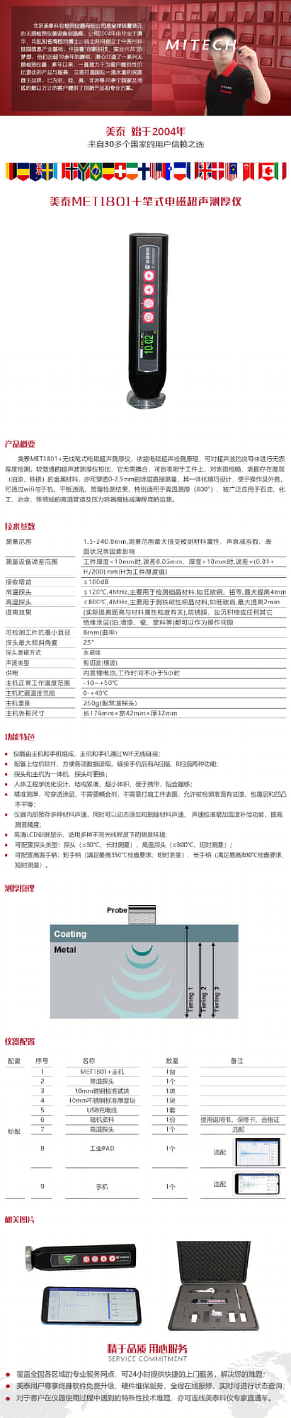 產(chǎn)品概述美泰MET1801+無線筆式電磁超聲測厚儀,依據(jù)電磁超聲檢測原理,可對超聲波的良導(dǎo)體進行無損厚度檢測。較普通的超聲波測厚儀相比,它無需耦合,可自吸咐于工件上,對表面粗糙、表面存在覆層(油漆、鐵銹)的金屬材料,亦可穿透0-2.5mm的涂層直接測量,其一體化精巧設(shè)計,便于操作及外攜,可通過wifi與手機、平板通訊,管理檢測結(jié)果,特別適用于高溫測厚(800°),被廣泛應(yīng)用于石油、化工、冶金、等領(lǐng)域的高溫管道及壓力容器腐蝕減薄程度的監(jiān)測。