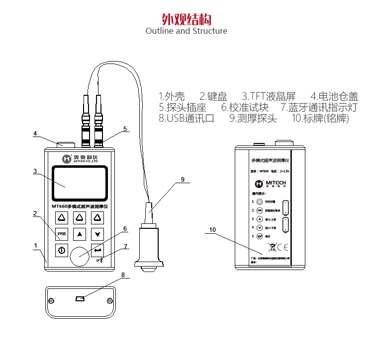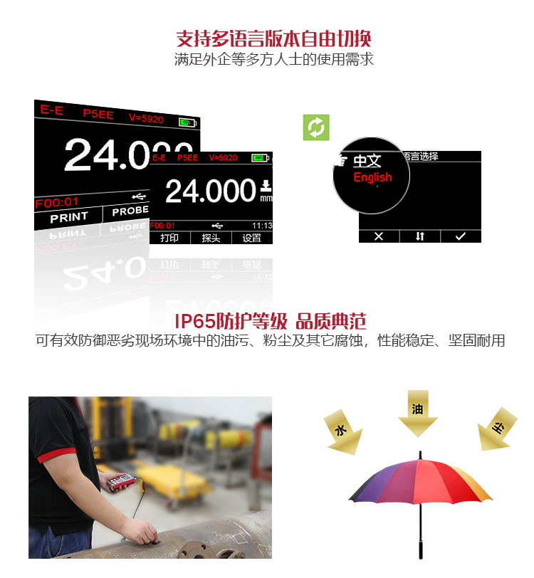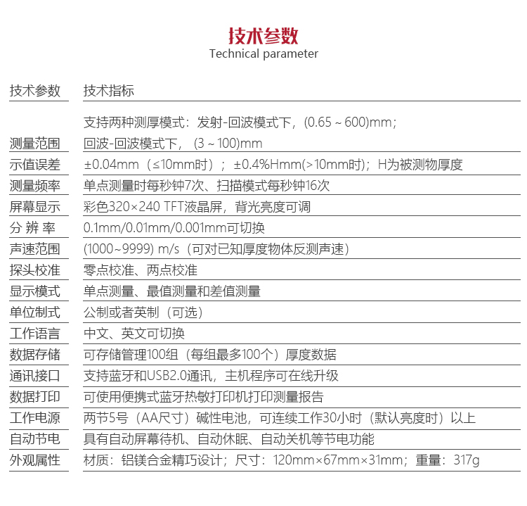可存儲(chǔ)管理100組(每組最多100個(gè))厚度數(shù)據(jù),支持藍(lán)牙和USB2.0通訊,主機(jī)程序可在線升級(jí)