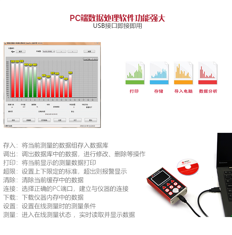 附帶USB數(shù)據(jù)處理軟件,可連接電腦進(jìn)行數(shù)據(jù)分析、存儲(chǔ)、打印等