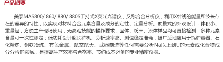產(chǎn)品概述美泰MAS800 / 860 / 880 /880S手持式X熒光光譜儀,又稱合金分析儀,利用X射線的能量存在差異的特性,以實現(xiàn)對材料合金元素含量及成分的定性、定量分析。便攜式的外觀設(shè)計,體積小、重量輕,方便生產(chǎn)現(xiàn)場使用;無高難技能的操作要求,固體、粉末、液體樣品均可直接檢測,多種元素含量可一次性測定;低功耗設(shè)計超長待機、分析速率高、測值穩(wěn)定準(zhǔn)確,被廣泛地應(yīng)用于鍋爐容器、石化精煉、鋼鐵冶煉、有色金屬、航空航天、武器制造等任何需要分析Na以上到U的元素或化合物成分分析的領(lǐng)域,是提高生產(chǎn)效率與合格率、節(jié)約成本必備的專業(yè)精密儀器。