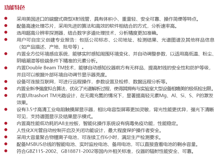 儀器特點采用美國進(jìn)口的端窗式微型X射線管,具有體積小、重量輕、安全可靠、操作簡便等特點。
