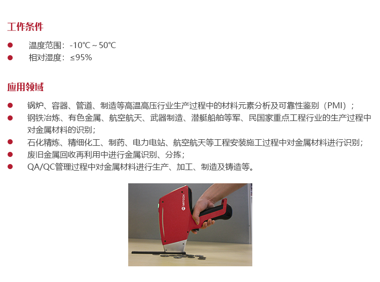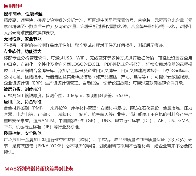 | 適用材料 | 用于檢測鐵基合金系列(不銹鋼、鉻/鉬合金鋼、低合金鋼、工具鋼、無縫鋼),鎳基合金系列(鎳合金、鎳/鈷超合金),鈷基合金系列,鈦基合金系列,銅基合金系列(青銅、黃銅、銅鎳合金等),高溫合金(鉬鎢合金), |