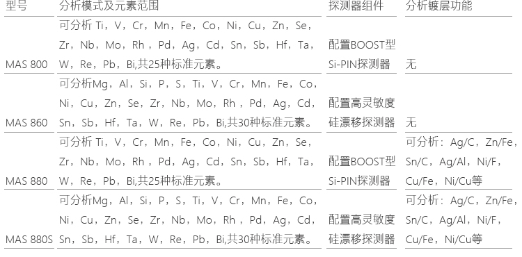 | 探測器 | MAS 800和MAS880配置BOOST型Si-PIN探測器,MAS 860和MAS880S配置高靈敏度硅漂移探測器 |