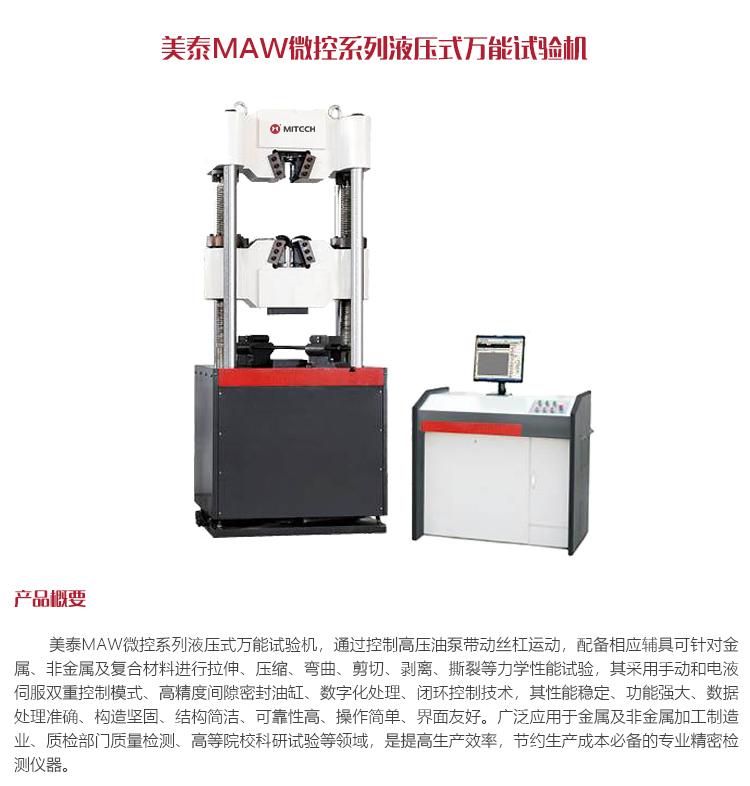 產(chǎn)品概述美泰MAW微控系列液壓式萬(wàn)能試驗(yàn)機(jī),通過(guò)控制高壓油泵帶動(dòng)絲杠運(yùn)動(dòng),配備相應(yīng)輔具可針對(duì)金屬、非金屬及復(fù)合材料進(jìn)行拉伸、壓縮、彎曲、剪切、剝離、撕裂等力學(xué)性能試驗(yàn),其采用手動(dòng)和電液伺服雙重控制模式、高精度間隙密封油缸、數(shù)字化處理、閉環(huán)控制技術(shù),其性能穩(wěn)定、功能強(qiáng)大、數(shù)據(jù)處理準(zhǔn)確、構(gòu)造堅(jiān)固、結(jié)構(gòu)簡(jiǎn)潔、可靠性高、操作簡(jiǎn)單、界面友好。廣泛應(yīng)用于金屬及非金屬加工制造業(yè)、質(zhì)檢部門(mén)質(zhì)量檢測(cè)、高等院??蒲性囼?yàn)等領(lǐng)域,是提高生產(chǎn)效率,節(jié)約生產(chǎn)成本必備的專(zhuān)業(yè)精密檢測(cè)儀器。
