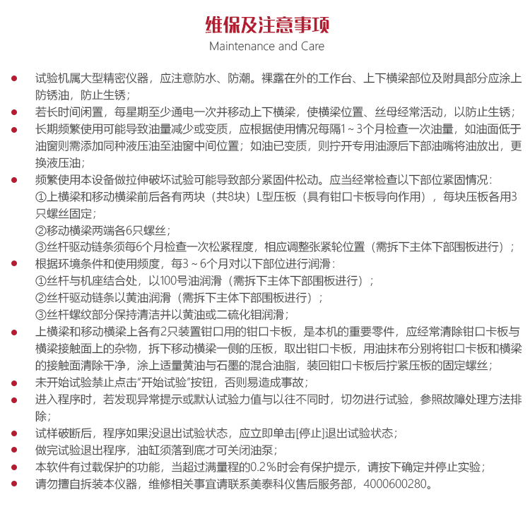 儀器的保養(yǎng)與維護(hù)試驗(yàn)機(jī)屬大型精密儀器,應(yīng)注意防水、防潮。裸露在外的工作臺(tái)、上下橫梁部位及附具部分應(yīng)涂上防銹油,防止生銹;