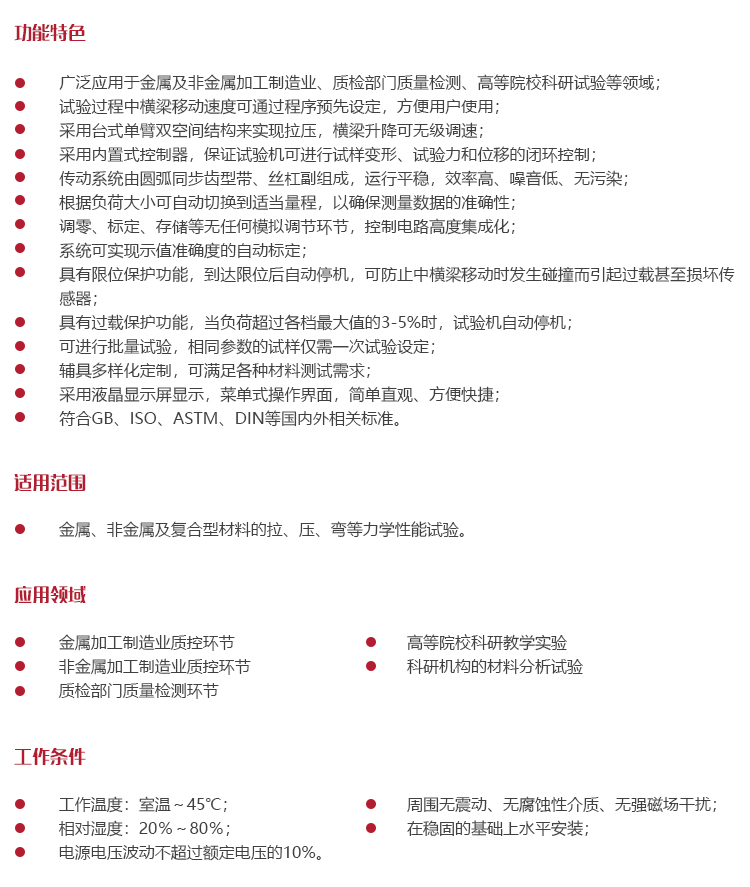 采用臺(tái)式單臂雙空間結(jié)構(gòu)來(lái)實(shí)現(xiàn)拉壓,橫梁升降可無(wú)級(jí)調(diào)速;