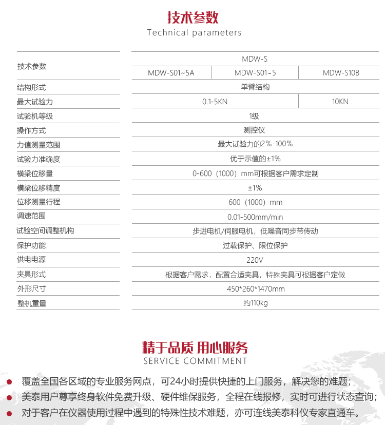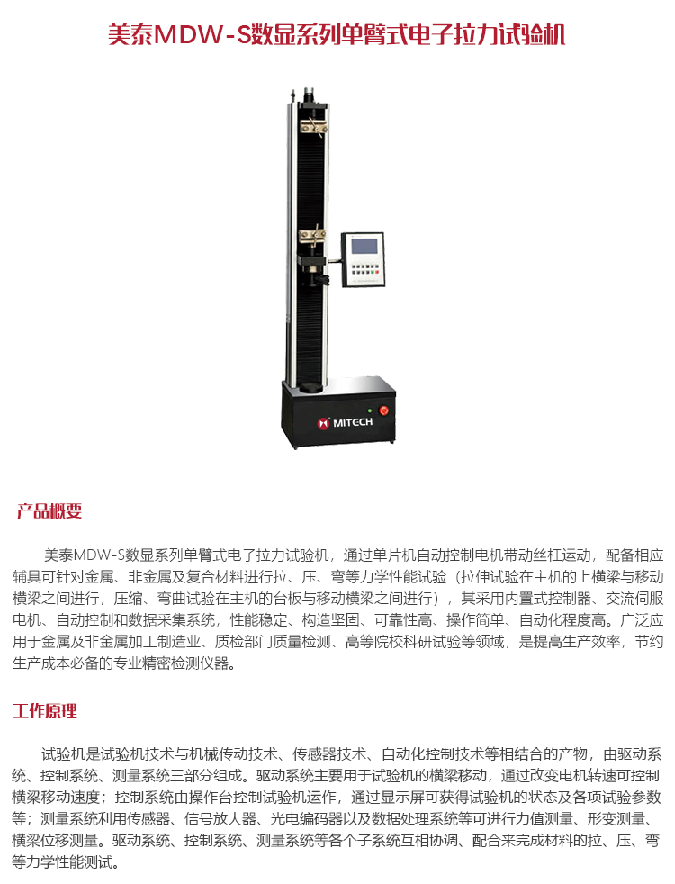 產(chǎn)品概述美泰MDW-S數(shù)顯系列單臂式電子拉力試驗(yàn)機(jī),通過(guò)單片機(jī)自動(dòng)控制電機(jī)帶動(dòng)絲杠運(yùn)動(dòng),配備相應(yīng)輔具可針對(duì)金屬、非金屬及復(fù)合材料進(jìn)行拉、壓、彎等力學(xué)性能試驗(yàn)(拉伸試驗(yàn)在主機(jī)的上橫梁與移動(dòng)橫梁之間進(jìn)行,壓縮、彎曲試驗(yàn)在主機(jī)的臺(tái)板與移動(dòng)橫梁之間進(jìn)行),其采用內(nèi)置式控制器、交流伺服電機(jī)、自動(dòng)控制和數(shù)據(jù)采集系統(tǒng),性能穩(wěn)定、構(gòu)造堅(jiān)固、可靠性高、操作簡(jiǎn)單、自動(dòng)化程度高。廣泛應(yīng)用于金屬及非金屬加工制造業(yè)、質(zhì)檢部門(mén)質(zhì)量檢測(cè)、高等院??蒲性囼?yàn)等領(lǐng)域,是提高生產(chǎn)效率,節(jié)約生產(chǎn)成本必備的專業(yè)精密檢測(cè)儀器。
