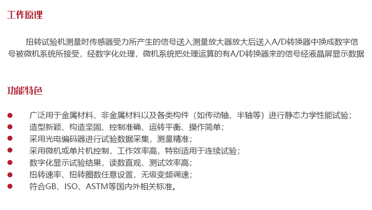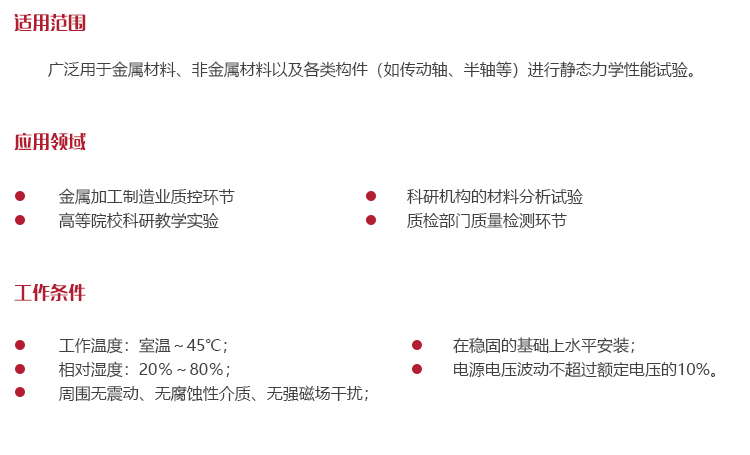 功能用途廣泛用于金屬材料、非金屬材料以及各類(lèi)構(gòu)件(如傳動(dòng)軸、半軸等)進(jìn)行靜態(tài)力學(xué)性能試驗(yàn)。