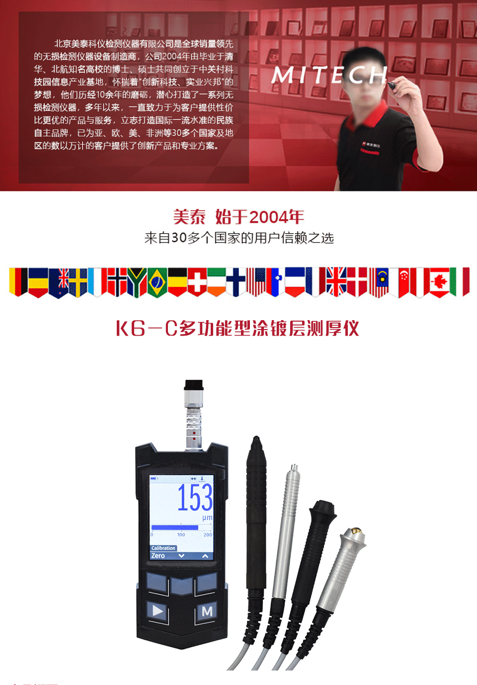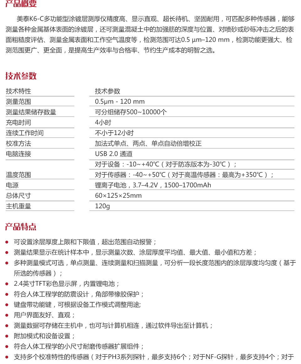 美泰K6-C多功能型涂鍍層測(cè)厚儀精度高、顯示直觀、超長(zhǎng)待機(jī)、堅(jiān)固耐用,可匹配多種傳感器,能夠測(cè)量各種金屬基體表面的涂鍍層,還可測(cè)量混凝土中的加強(qiáng)筋的深度與位置、對(duì)噴砂或砂礫沖擊之后的表面粗糙度評(píng)估、測(cè)量金屬表面和工作空氣溫度等,檢測(cè)范圍可達(dá)0.5 μm–120 mm,檢測(cè)功能更強(qiáng)大、檢測(cè)范圍更廣、更全面,是提高生產(chǎn)效率與合格率、節(jié)約生產(chǎn)成本的明智之選。