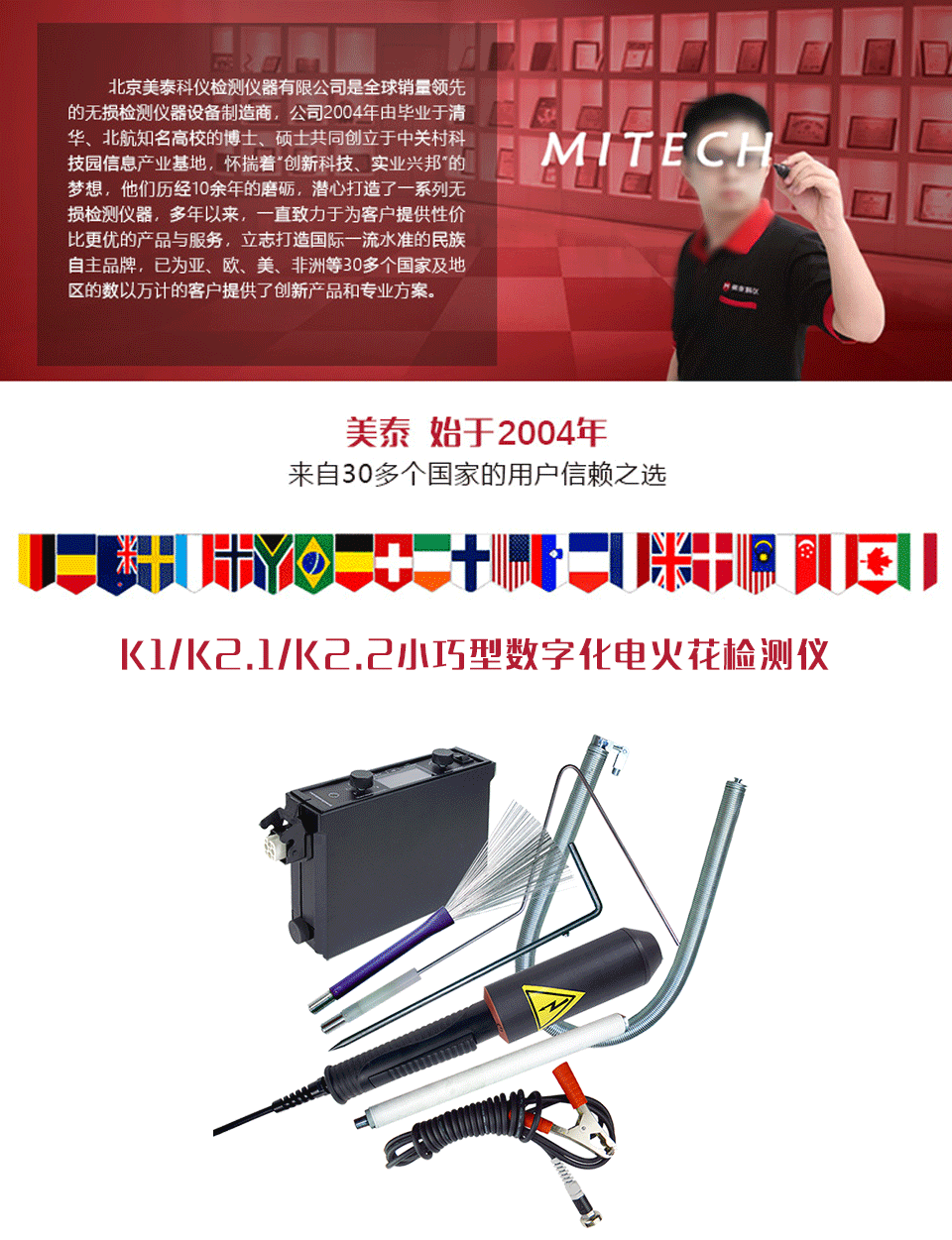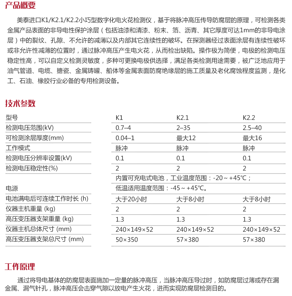 產(chǎn)品概述美泰進口K1/K2.1/K2.2小巧型數(shù)字化電火花檢測儀,基于將脈沖高壓傳導防腐層的原理,可檢測各類金屬產(chǎn)品表面的非導電性保護涂層(包括油漆和清漆、粉末、箔、瀝青、其它厚度可達1mm的非導電涂層)中的裂紋、孔隙、不允許的減薄以及內(nèi)部其它連續(xù)性的破壞。在探測器經(jīng)過表面涂層有連續(xù)性破壞或非允許性減薄的位置時,通過脈沖高壓產(chǎn)生電火花,從而檢出缺陷。操作極為簡便,電極的檢測電壓穩(wěn)定性高,可以自定義檢測靈敏度,多種可更換電極供選擇,滿足各類檢測用途需要,被廣泛地應用于油氣管道、電纜、搪瓷、金屬鑄罐、船體等金屬表面防腐絕緣層的施工質(zhì)量及老化腐蝕程度監(jiān)測,是化工、石油、橡膠行業(yè)必備的專用檢測設備。
