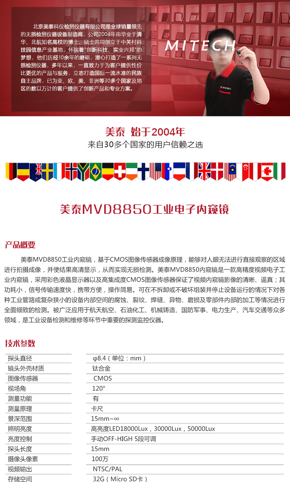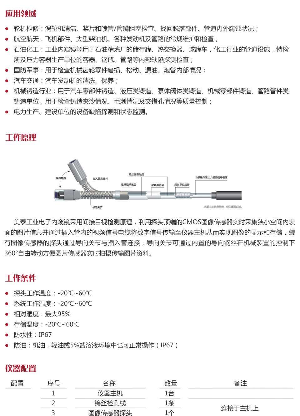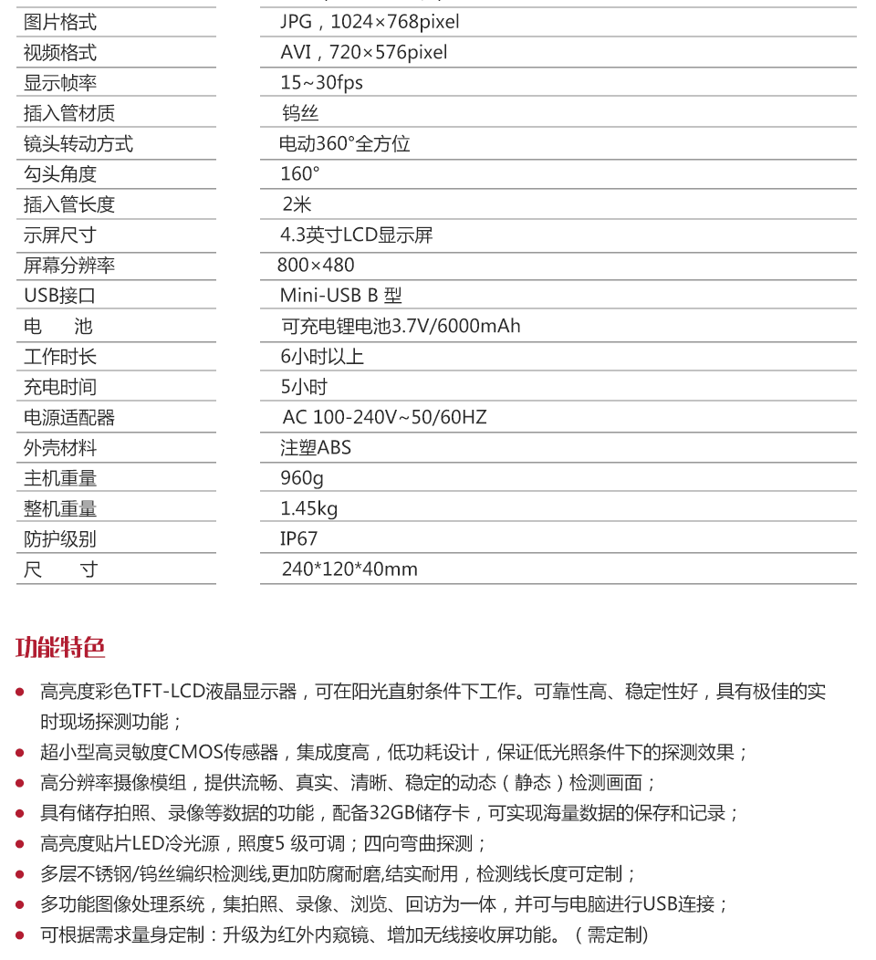 產(chǎn)品概述美泰MVD8850工業(yè)內(nèi)窺鏡,基于CMOS圖像傳感器成像原理,能夠對人眼無法進(jìn)行直接觀察的區(qū)域進(jìn)行拍攝成像,并使結(jié)果高清顯示,從而實(shí)現(xiàn)無損檢測。美泰MVD8850內(nèi)窺鏡是一款高精度視頻電子工業(yè)內(nèi)窺鏡,采用彩色液晶顯示器以及高集成度CMOS圖像傳感器保證了視頻內(nèi)窺鏡影像的清晰、逼真;其功耗小,信號(hào)傳輸速度快,攜帶方便,操作簡易??稍?/span>不拆卸或不破壞組裝并停止設(shè)備運(yùn)行的情況下對各種工業(yè)管路或復(fù)雜狹小的設(shè)備內(nèi)部空間的腐蝕、裂紋、焊縫、異物、磨損及零部件內(nèi)部的加工等情況進(jìn)行全面細(xì)致的檢測。被廣泛應(yīng)用于航天航空、石油化工、機(jī)械鑄造、國防軍事、電力生產(chǎn)、汽車交通等眾多領(lǐng)域,是工業(yè)設(shè)備檢測和維修等環(huán)節(jié)中重要的探測監(jiān)控儀器。