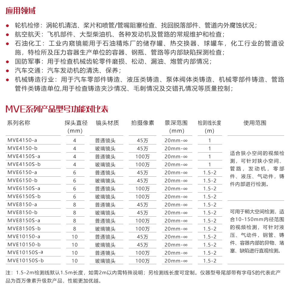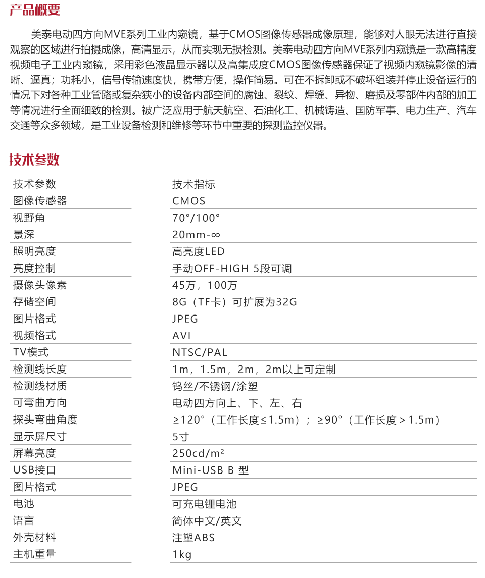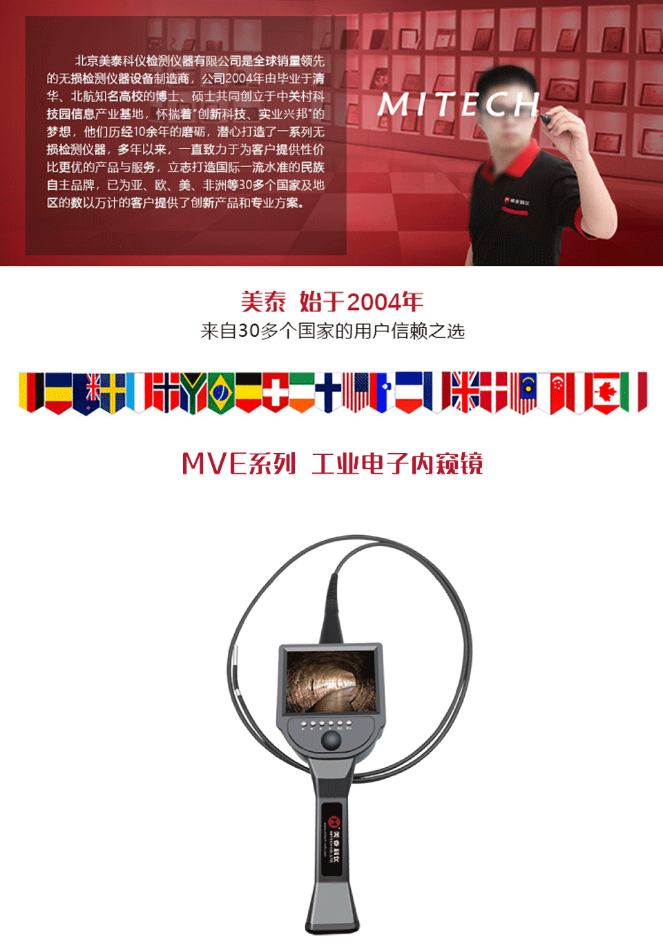 美泰電動四方向MVE系列工業(yè)內窺鏡,基于CMOS圖像傳感器成像原理,能夠對人眼無法進行直接觀察的區(qū)域進行拍攝成像,高清顯示,從而實現(xiàn)無損檢測。美泰電動四方向MVE系列內窺鏡是一款高精度視頻電子工業(yè)內窺鏡,采用彩色液晶顯示器以及高集成度CMOS圖像傳感器保證了視頻內窺鏡影像的清晰、逼真;功耗小,信號傳輸速度快,攜帶方便,操作簡易。可在不拆卸或不破壞組裝并停止設備運行的情況下對各種工業(yè)管路或復雜狹小的設備內部空間的腐蝕、裂紋、焊縫、異物、磨損及零部件內部的加工等情況進行全面細致的檢測。被廣泛應用于航天航空、石油化工、機械鑄造、國防軍事、電力生產、汽車交通等眾多領域,是工業(yè)設備檢測和維修等環(huán)節(jié)中重要的探測監(jiān)控儀器。