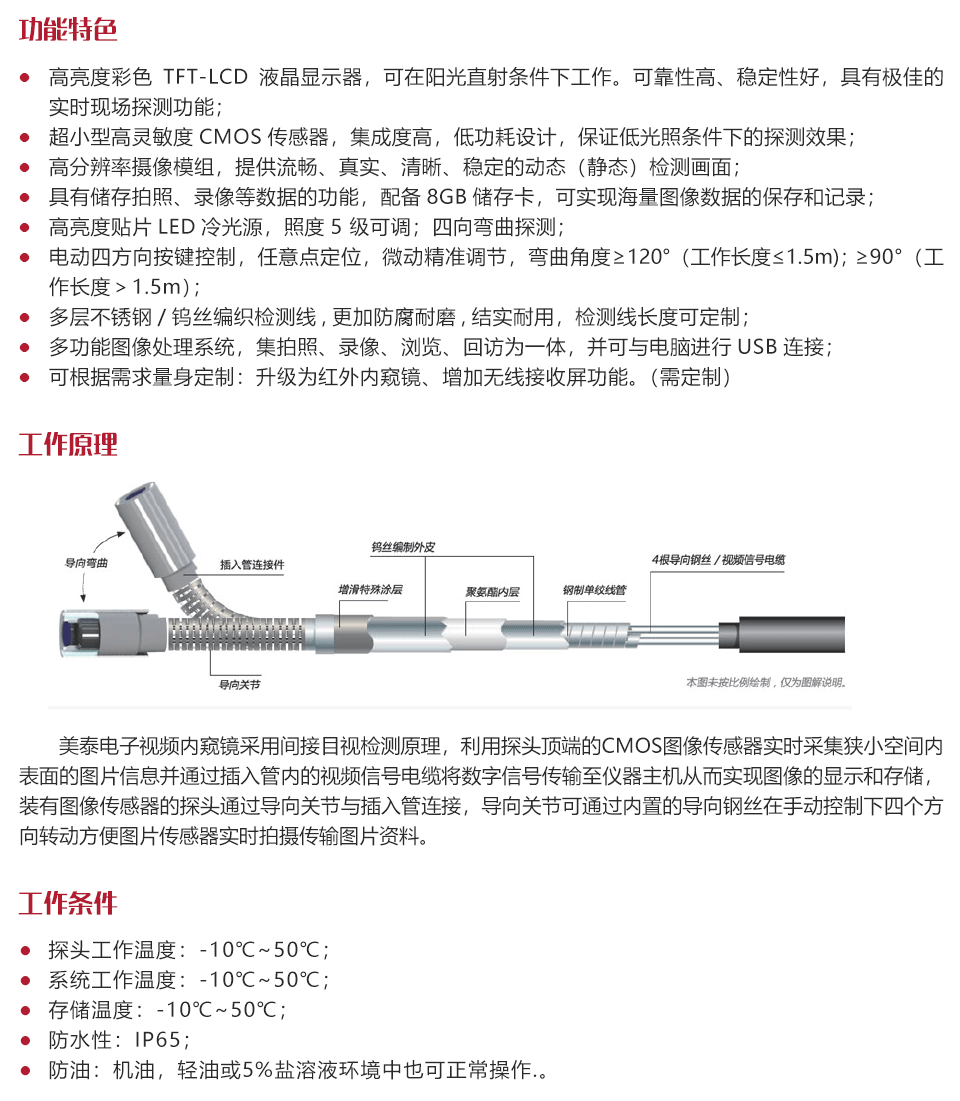 工作原理美泰電子視頻內窺鏡采用間接目視檢測原理,利用探頭頂端的CMOS圖像傳感器實時采集狹小空間內表面的圖片信息并通過插入管內的視頻信號電纜將數(shù)字信號傳輸至儀器主機從而實現(xiàn)圖像的顯示和存儲,裝有圖像傳感器的探頭通過導向關節(jié)與插入管連接,導向關節(jié)可通過內置的導向鋼絲在微型電機控制下四個方向轉動方便圖片傳感器實時拍攝傳輸圖片資料。